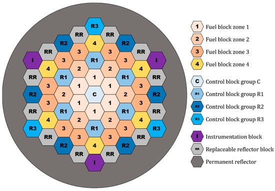 Table 1 summarizes the major design parameters of HTTR. The reactor configuration includes hexagonal fuel blocks organized into 30 columns, with each column comprising five fuel blocks and two reflector blocks (located at the top and bottom). The fuel blocks are categorized into four groups based on their spatial arrangement within the core. Fuel enrichment varies among the fuel blocks, with lower enrichment positioned near the core center. Axially, the fuel enrichment also varies, resulting in higher enrichment at the top core region. Overall, the HTTR features 12 distinct types of fuel blocks, each with enrichments ranging from 3 to 10 wt.%.