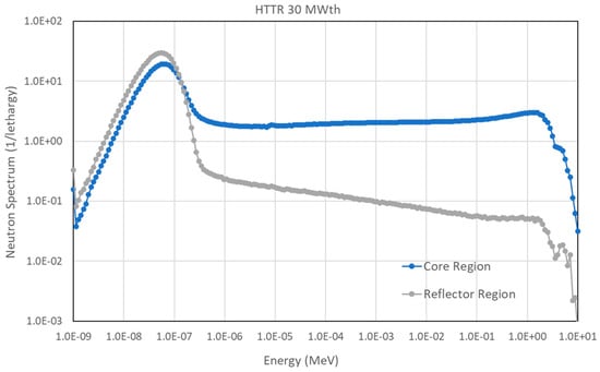 The MCNP6.2 criticality analysis results (keff) for three nuclear data libraries—JENDL-5, ENDF/B-VIII.0, and ENDF/B-VII.1—are presented in Table 3. Additionally, neutron spectra in both the core and reflector regions are depicted in Figure 3. The keff values for ENDF/B-VIII.0 and ENDF/B-VII.1 were extracted from our prior work [11]. From the Handbook of the International Reactor Physics Experiment Evaluation (IRPhE), the reported experimental keff value is 1.0025, accompanied by an uncertainty range of −σ = 0.0060 and +σ = 0.0071 (Reference [12]: Table 2.64 and Table 4.1). Notably, the document explicitly states that no biases have been evaluated to correct the expected experimental keff, except for the bias related to removing reactor instrumentation from the instrumentation columns. The uncertainty assessment meticulously accounts for both systematic and random uncertainties arising from dimensions and material compositions, including impurities.