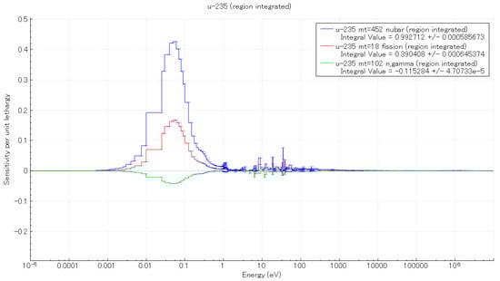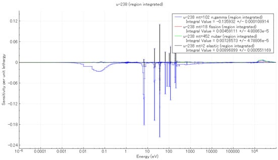 Additionally, energy-dependent sensitivities of the keff for major nuclide-reaction pairs are shown in Figure 4, Figure 5, Figure 6 and Figure 7. These sensitivity profiles exhibit remarkable similarity to our previous work [11], and interested readers can find further details in the referenced study.