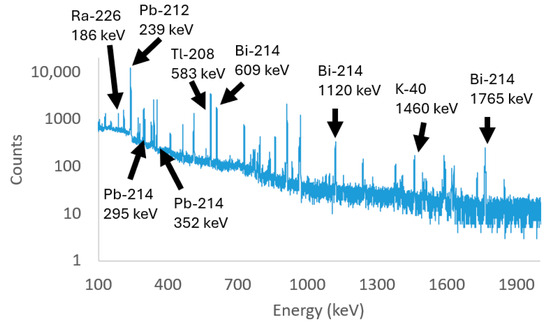 Gamma radiation spectrum of PB from refinery B as a typical example to illustrate the method used. The horizontal axis shows the gamma radiation energy in keV, and the vertical axis shows the number of counts on a logarithmic scale. The peaks used for analysis are highlighted. Net counts were measured using Gamma 2k.