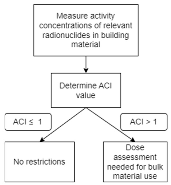 where denotes the activity concentration of the radionuclide in Bq/kg. ACI values are used to assess whether a material requires further dose evaluation before its application in construction. The threshold values and corresponding decisions are illustrated in Figure 2.