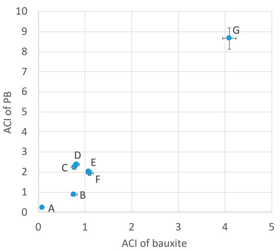 The relationship between the activity concentration index (ACI) of processed bauxite (PB) and average bauxite used in each refinery. As the ACI of bauxite increases, the ACI of PB increases. A cluster of samples can be observed with the ACI of the PB being near 2, while singular samples are found to have significantly lower and higher ACI values for both bauxite and PB—respectively, A and G.