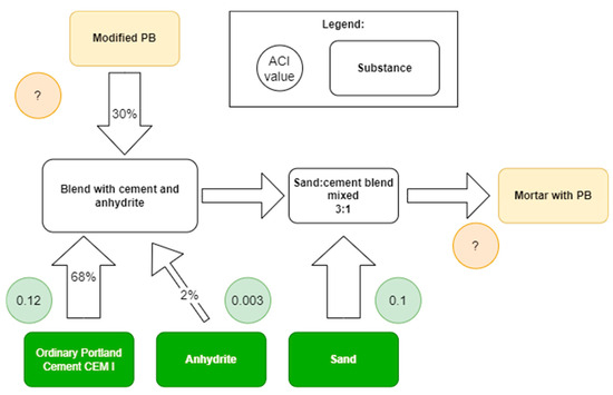 A material flow schematic describing the process of mixing mortar from the constituents. Known ACI values for the ordinary Portland cement, anhydrite, and sand are shown, while the ACI values of the used modified PB and mortar with PB are variables. If the ACI value of the modified PB is known, an estimation based on successive weighted averages can be made for the ACI value of the mortar.