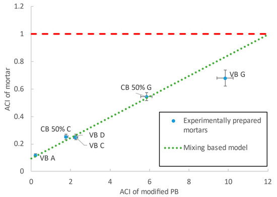 The calculated mixing-based estimation behaves well compared to the available data for the prepared mortars and the used modified PB (Figure 5). Notably, the mixing-based model overestimates the data for higher PB activities. This conservative behavior is desirable from a radiological safety perspective. The data presented in Figure 5, along with the ACI values of the associated input materials, are shown in Table 2 to clarify the variation of ACI values along the product chain.