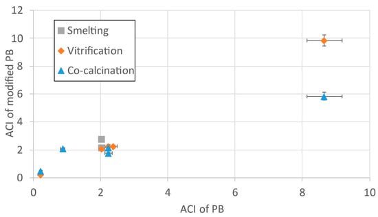 Variations between technologies when creating modified PB from the same BR source. The technologies generally show similar ACI values of modified PB made from the same PB, with a slight trend of technologies with the higher inclusion rate of PB in the process mix showing higher ACI values, as expected. This difference is especially pronounced when the ACI value of the PB is significantly higher than the other constituents, as can be seen in the co-calcined and vitrified samples prepared from the PB from refinery G.