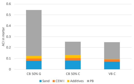 The main contributors are modified PB, due to its higher ACI value, and sand, due to its substantial mass fraction in the final mortar. The difference in the magnitude of the contribution from additives when comparing co-calcined and vitrified mortars stems from the nature of the additives: the kaolinite used for co-calcination has an ACI value of 0.51 and a comparatively higher inclusion rate, while the additives for vitrification have an ACI value of 0.1 or less.