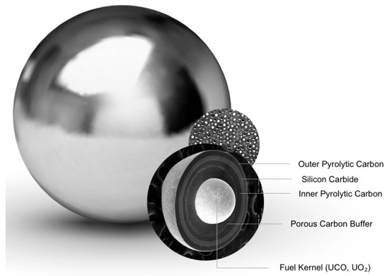 The first prototype PBR (i.e., the German AVR) was initially fueled using carbide Bi-structural ISOtropic (BISO) fuel. However, during the last 5 years of its operation, TRi-structural ISOtropic (TRISO) fuel was used. TRISO fuel is a nuclear fuel composed of tiny (~1 mm in diameter) particles of fissile materials, most frequently uranium, coated in layers of cladding materials that are usually composed of pyrocarbon and silicon carbide, as shown in Figure 1. Thousands of these TRISO particles are then placed into a larger pebble, with the space between and around them being filled with graphite [2]. The considerable amount of layering between the fissile fuel and the outside of each pebble is one of the primary benefits of using TRISO fuel over traditional oxide fuel pellets. The presence of pyrocarbon and silicon carbide keeps fission products contained, preventing them from leaking into the coolant. The other considerable advantage over traditional fuel is its high durability in the face of high pressures and temperatures. While the Zircaloy rods used in pressurized water reactors (PWRs) can only withstand temperatures up to 647 K (374 °C), TRISO fuel is designed to survive as high as 1800 °C [9]. It also resists corrosion and chemical degradation, ensuring long-term stability. These attributes collectively position TRISO fuel as the most viable and robust fuel form for the inherently dynamic and high-temperature environment of modern Pebble Bed Reactors. An example of an Xe-100 fuel pebble and TRISO fuel particle can be seen in Figure 1, with the material compositions shown in Table 1 and Table 2.