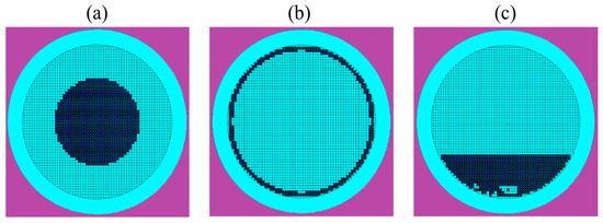 Using the same method from the Even model, the radius restriction was changed for these two models. For the Iris model, the particles were limited to generating between two radii of the pebbles, forming a spherical shell of TRISO particles. For the Pupil model, they were limited to a smaller radius inside the pebble. For data consistency, the number of particles within these models were kept the same as the Even model, that is, 18,949 TRISO particles. This required several steps. First, it required a shrinking of the lattice width. The distance between particles needed to be reduced to allow for more particles within a smaller volume. However, there was no geometry that allowed for the generation of precisely the same number of particles. This led to the necessity of the manual removal of several particles from the input files. Related to the Iris and Pupil versions was the Bottom version, in which all the particles are placed at the bottom of the pebble. This model was created by restricting the generation of particles to the lowest z-levels of the lattice. Again, this version did not contain the exact number of particles upon creation, and manual elimination of a few particles was required. This model represents another possible incorrectly manufactured pebble, with all the TRISOs accidentally placed near the bottom. The geometries of Pupil, Iris, and Bottom models are visualized in Figure 3.