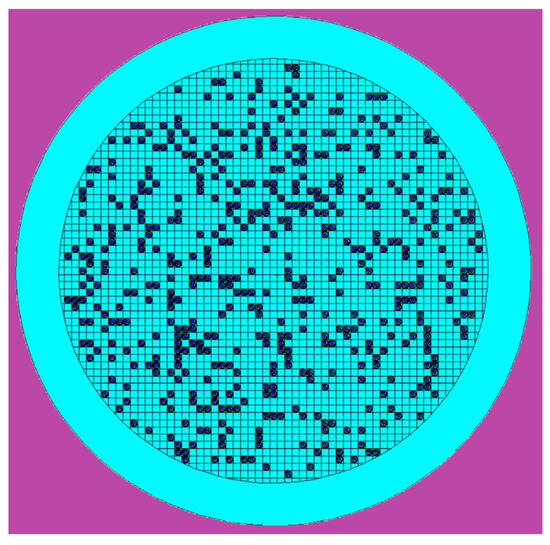 The heterogeneous, evenly distributed pebble was developed through a geometric “for”-loop in Python3.12. This model used a 35 × 35 × 35 lattice to place TRISO particles throughout the pebble. The particles are packed in simple cubic (SC) configuration. The program would cycle through z-axis levels, using x and y values on that level to determine the position of a prospective particle. This position would then be used in the Pythagorean theorem to test the distance from the edge of the pebble. This allowed for the generation of particles without being cut along the edge of the pebble by limiting particle generation to within the fuel region of the pebble. This process was completed in ~20 s using a typical personal computer, allowing for rapid creation of an MCNP lattice. This did have several drawbacks, however. The number of particles was not precisely 19,000, as a real-life pebble would aim to contain. Still, at 18,949, it was extremely close. The limits of programmed geometry and the dimensions of the pebble and particle limited the number of particles to only approximating realistic goals. Given the constraint of the pebble’s constant diameter, the goal of 19,000 particles could only be approximated with a fixed lattice. However, it did provide the added benefit of being easily edited and much faster than manually producing lattices, although manual lattices have been used in the past in a similar manner [1]. For clarity, this model, shown in Figure 2, is referred to as the “Even” pebble model. Note that the teal region is graphite and the purple part represents the helium cube.