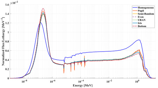 Neutron energy spectra for various pebble geometries. A softer neutron spectrum, characterized by a higher fraction of thermal neutrons, is observed in geometries with more irregular TRISO distributions.