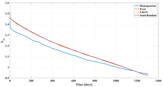 The change in k∞ with burnup in the different models. Models with more irregular or heterogeneous particle distributions exhibit a slower decline in k∞ relative to the homogeneous model.