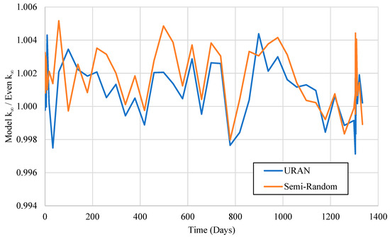 The pattern of these curves indicates the randomized models (URAN and Semi-Random) appear to have k∞ values that are statistically greater than the Even model (the ratio is greater than 1.000). However, when comparing the URAN and Semi-Random models to each other, they visually appear to be statistically the same. This implies that randomization has a slight but statistically significant impact on k∞. Also, the method of randomization appears to impact the evolution of k∞, as the more randomized model (Semi-Random model in this case) tends to have slightly higher k∞.