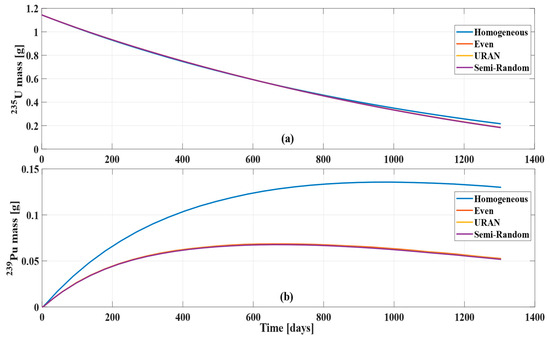 Another important factor to consider for burnup are the major actinides that are produced and consumed. The concentration of different actinides at different burnup values is important from both a fuel consumption standpoint as well as a nonproliferation standpoint. In terms of fuel consumption, if sufficient fissionable materials remain in the pebble to be critical, then the pebble is worth reusing. Unfortunately, high levels of fissionable materials can also make the pebbles more attractive for weaponization, with the production of 239Pu being of particular importance [30,31,32,33]. The evolution of 235U and 239Pu inventories, as predicted using various pebble models, is shown in Figure 9.