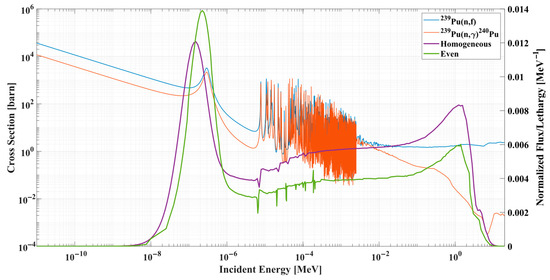 ENDF/B-VII.1 cross-sections of 239Pu (n, γ) 240Pu and 239Pu (n, f) reactions on the left y-axis, and neutron energy spectrum for the Homogeneous and Even models on the right y-axis.