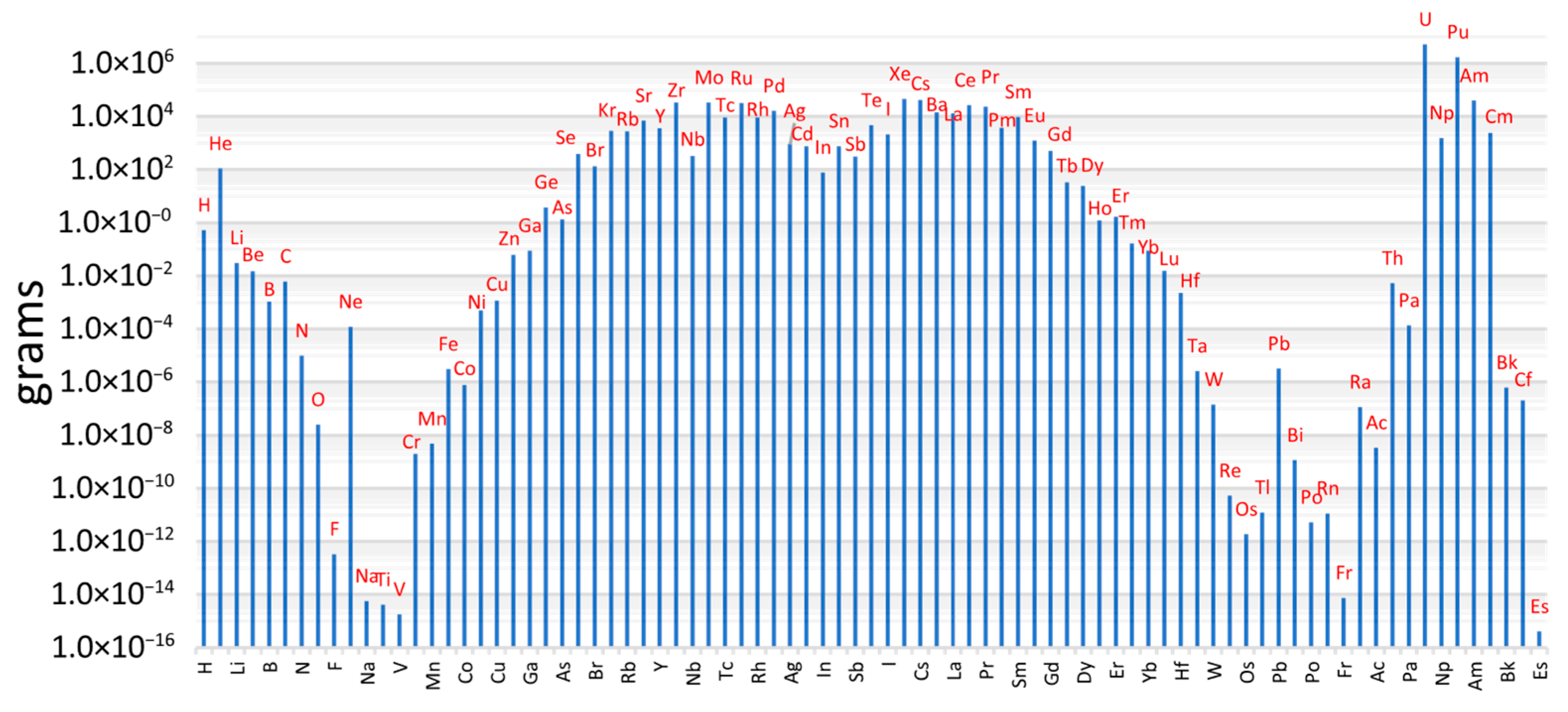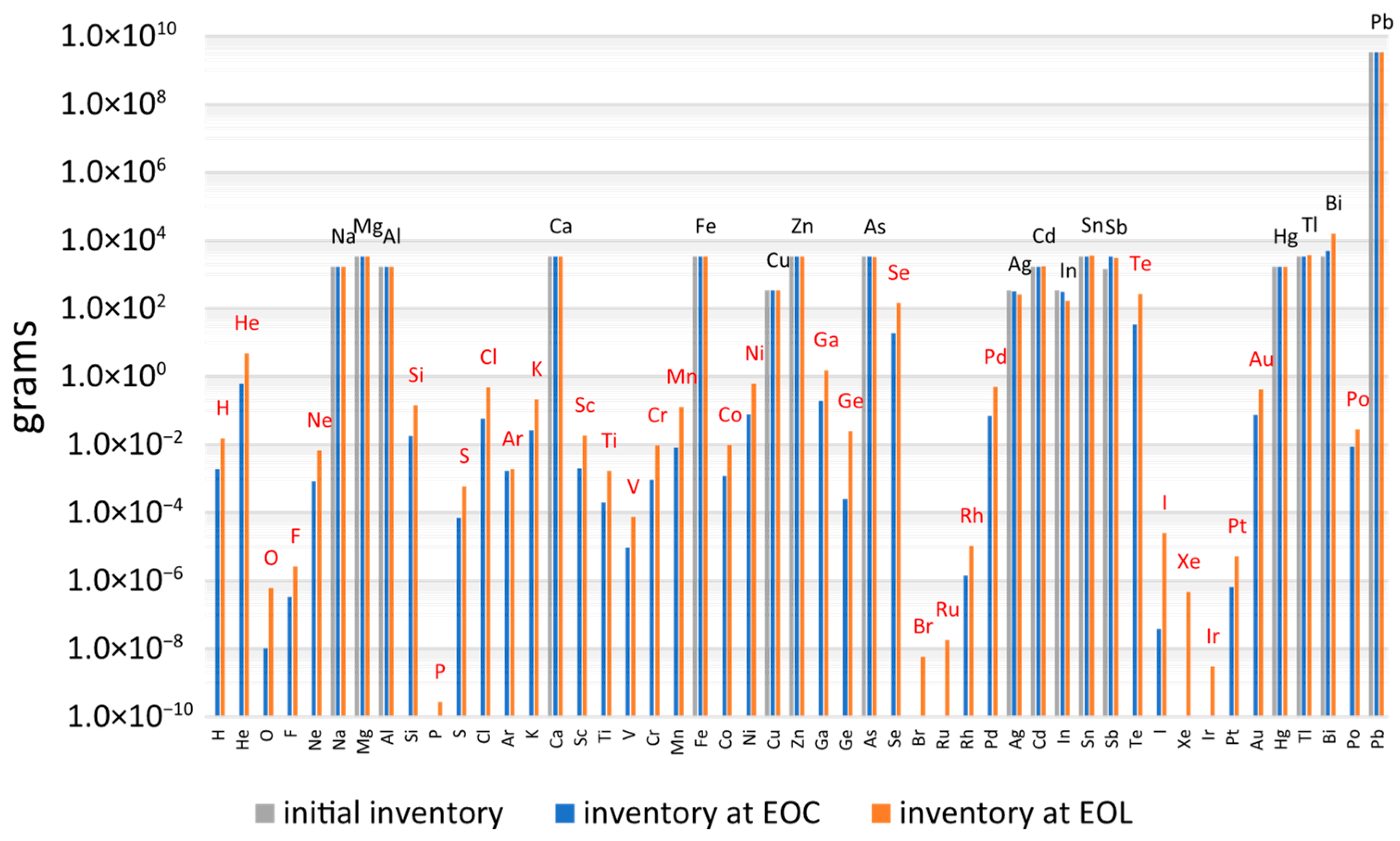 Figure 3 illustrates the mass inventory of the APs within the ALFRED lead coolant. Elements depicted in black represent intrinsic impurities, based on the composition of the C00 commercial-grade lead [