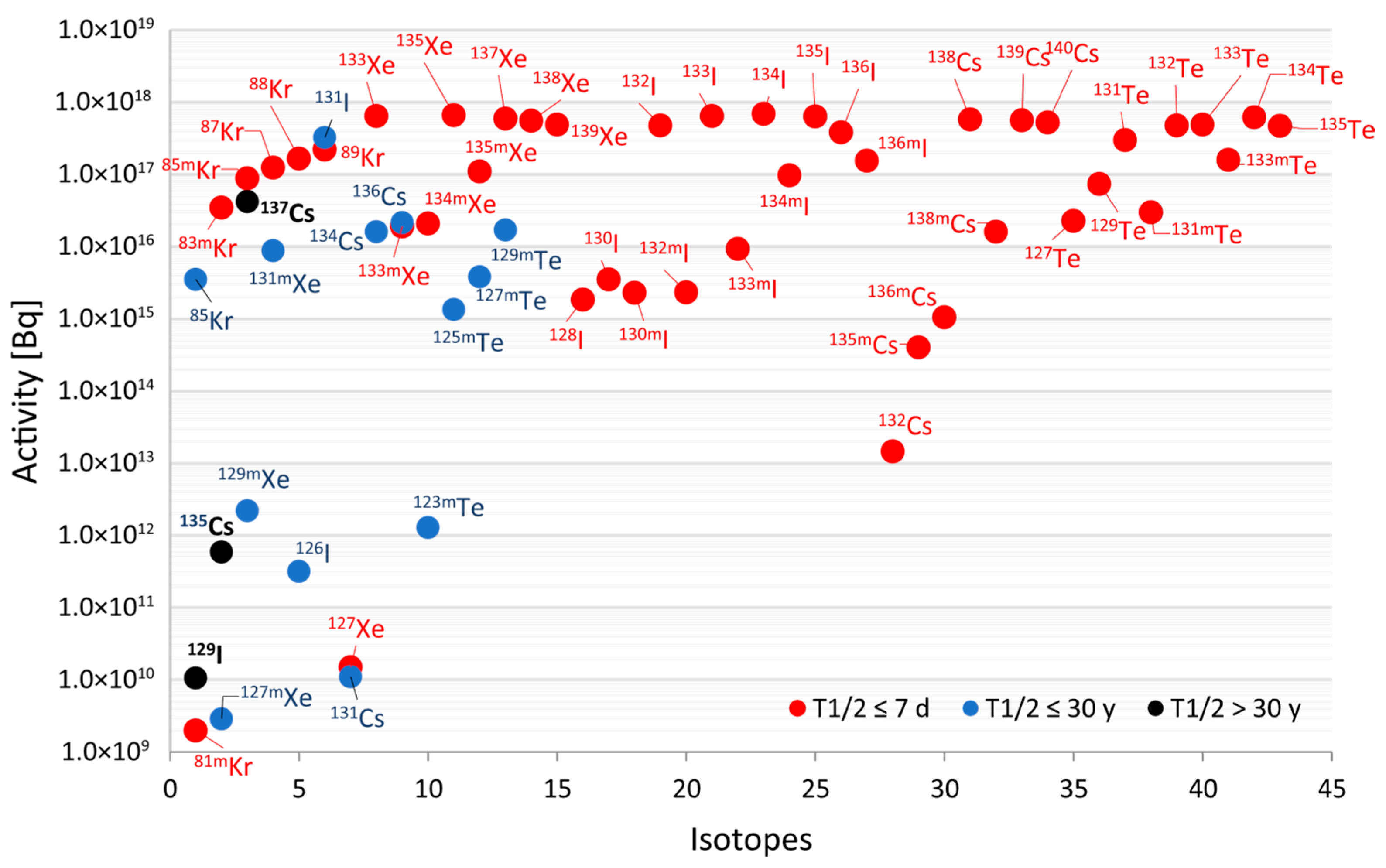 Figure 2. To emphasise radiologically significant contributors, only those radionuclides with an activity exceeding 1GBq are included. Isotopes depicted with red dots are very short-lived isotopes (T½ ≤ 7 days) and account for the majority of the total activity among the most volatile FPs. Short-lived isotopes (T½ ≤ 30 years), shown in blue, and long-lived isotopes (T½ >30 years), shown in black, contribute less than 4% to the total volatile activity.