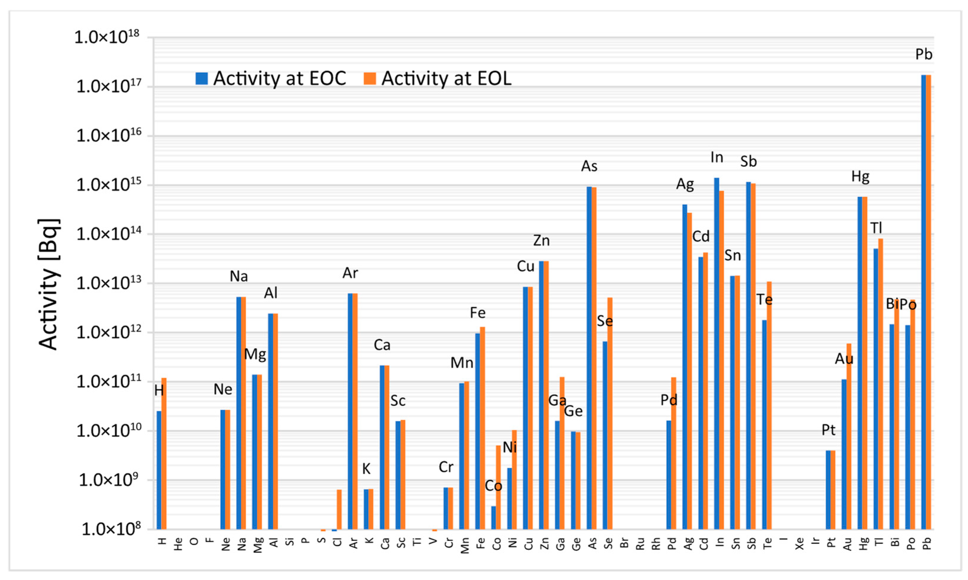 17]. The analysis assumed continuous irradiation of the entire lead volume (approximately 3400 t) over the reactor’s lifetime, applying a flux spectrum averaged across the primary circuit and using the parameters for the core outlined previously. The resulting radionuclide inventory provides the critical input for evaluating source terms and radiological impact studies.