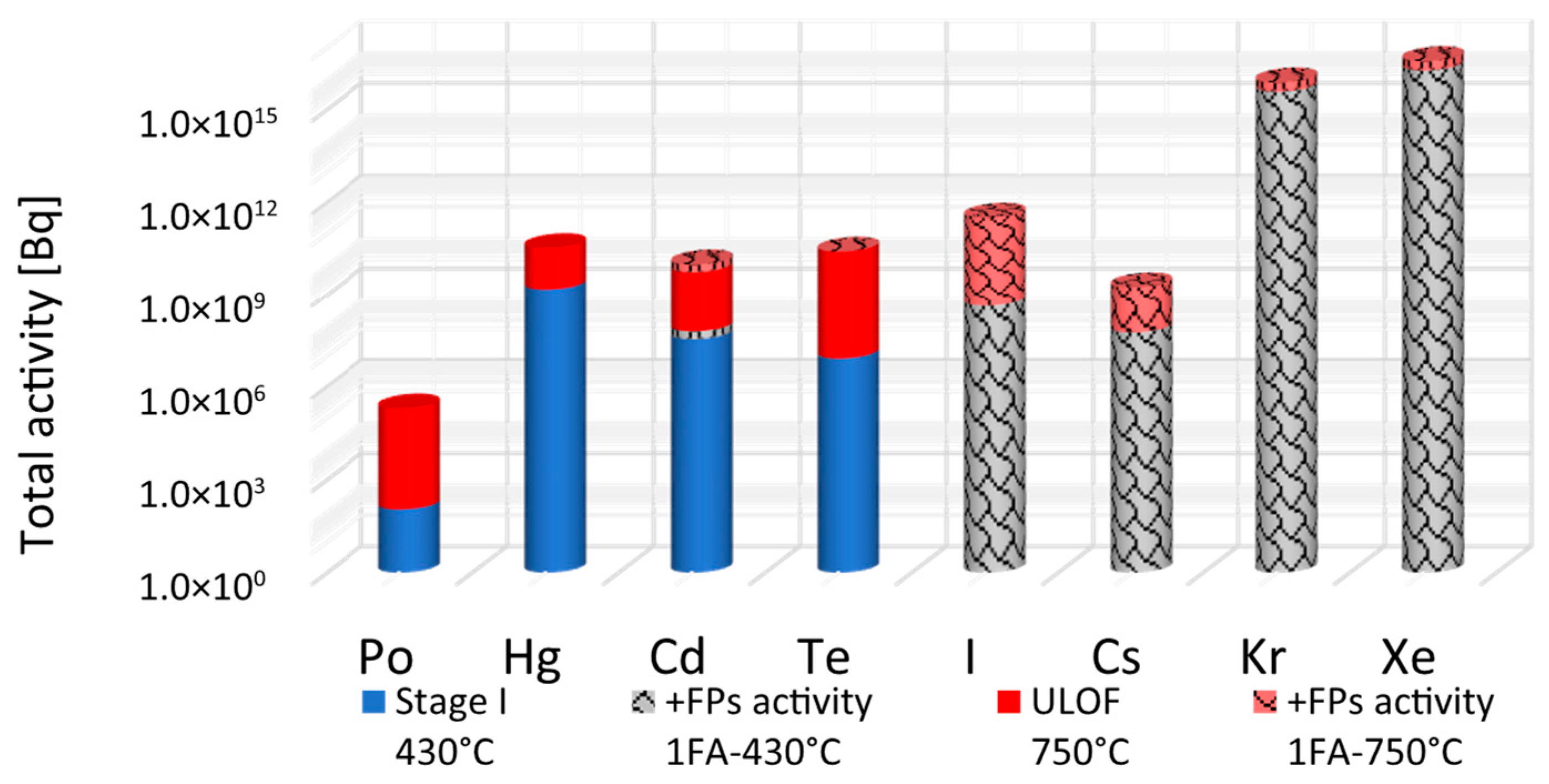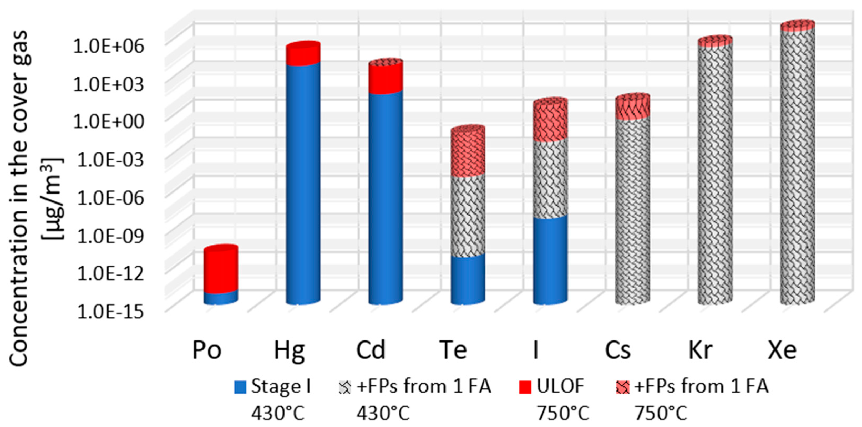 Figure 7 presents these concentrations for APs at normal operating temperatures (430 °C, blue columns), an elevated temperature corresponding to the ULOF scenario (750 °C, red columns), and an accidental release case (striped columns) including FPs from a single fuel assembly. As expected, higher temperatures and the release of FPs significantly raise the gas-phase concentrations, underlining the importance of efficient online monitoring of the cover gas chemical composition as an indicator of abnormal conditions in the reactor.
