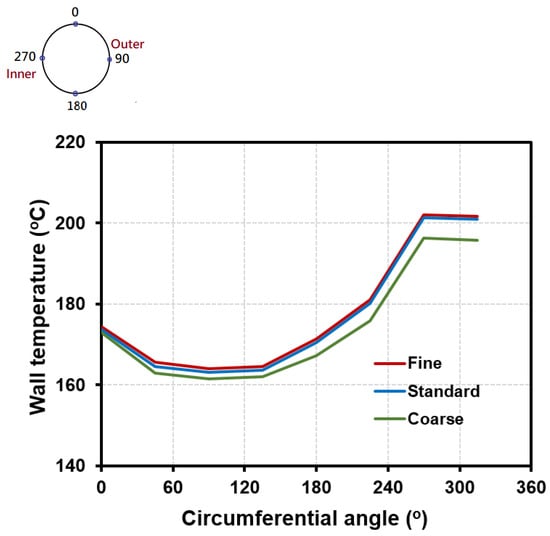 An experimental approach [21] to measuring the non-uniform circumferential distribution of wall temperature and the heat transfer coefficient in an HCT was adopted to assess the CFD methodology developed in this study. Figure 1 shows the schematics of the HCT for these simulations. The right portion of this figure shows the circumferential angle (ϕ) on the HCT wall. The corresponding mesh distributions on the cross-section of the HCT are indicated in Figure 2. Based on the requirements of the CFD Best Practice Guidelines [20], structured grids were used near the wall, and mesh-independent calculations were performed. Sensitivity simulations for the various meshes were applied on the cross-section of the HCT, including 860 (Coarse), 1425 (Standard), and 3525 (Fine) cells, respectively. The corresponding values of y+ for these three mesh models are 28.9~36.2 (Coarse), 0.8~1.2 (Standard), and 0.6~1.1 (Fine). Uniform grids along the HCT with 10° helical coil intervals were used. Constant heat flux was set at the tube wall, the inlet mass flux and temperature were set at the tube inlet, and the pressure was set at the tube outlet. The simulation conditions for all cases are listed in Table 2. Figure 3 compares the predicted results for the circumferential distribution of wall temperature at x = −0.147 under the coarse, standard, and fine meshes. The conditions of Case 1 in Table 2 and the SSTKW turbulence model were adopted. In this figure, the abscissa represents the circumferential angle (ϕ) of the HCT. Similar to the location index using quality (x) in the measured data presented by Wang et al., [21], x was also used as the location index of the HCT in this study. As illustrated in the upper portion of Figure 3, ϕ = 90° and 270° are the tube wall values on the outer and inner sides, respectively, of the HCT. This figure implies that the predicted result of the circumferential temperature distribution using the standard mesh is close to the result obtained using the fine mesh.