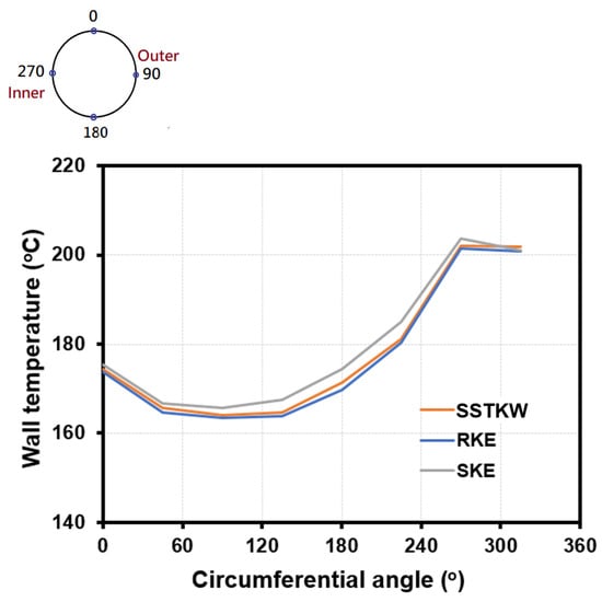 Since the BPGs provide useful guidance for single-phase applications of CFD models to nuclear reactor safety (NRS) problems, these guidelines were followed to ensure the accuracy and credibility of the CFD predictions. The essential requirements of the BPGs were applied in the mesh model; the physical models, especially the turbulence model; and in model validation. Therefore, in addition to the mesh model, sensitivity calculations for the turbulence models were also conducted, including the SKE, RKE, and SSTKW. The results of blind calculations for different turbulence models are shown in Figure 4, and the simulation conditions are the same as those in Figure 3. As shown in this figure, the predicted results of the circumferential wall temperature distribution at x = −0.147 when using the SSTKW and the RKE models are similar. The SSTKW and RKE turbulence models provide superior performance for flow characteristics with an adverse pressure gradient, recirculation, and separation, which are similar to the flow characteristics of an HCT. The SSTKW is less sensitive to the inlet turbulence properties and less restrictive than the near-wall mesh model. Therefore, the SSTKW turbulence model and standard mesh were selected for further study (Figure 5, Figure 6 and Figure 7) with the experimental data and then applied to the thermal-hydraulic characteristics of an HCT with confidence.