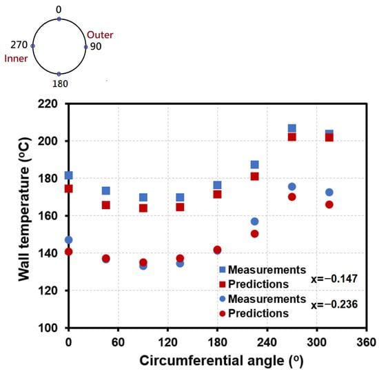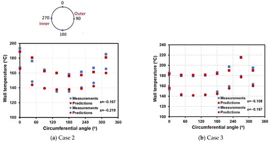 Figure 7. Comparison of circumferential distribution of wall temperature between predictions and measurements for Case 2 (a) and Case 3 (b).