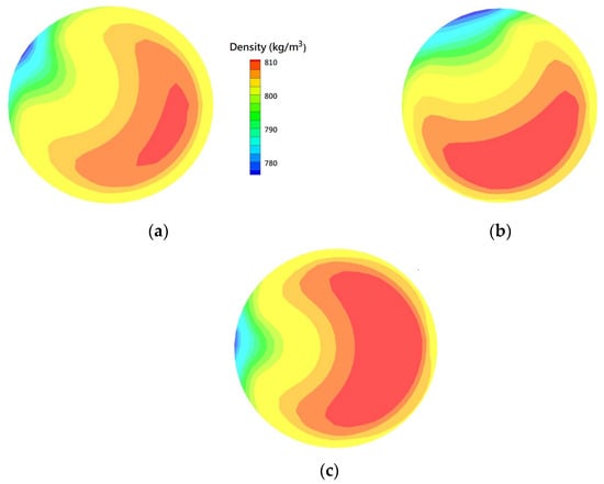 Figure 6. Density contours on cross-section of HCT for (a) Case 1; (b) Case 2; (c) Case 3.