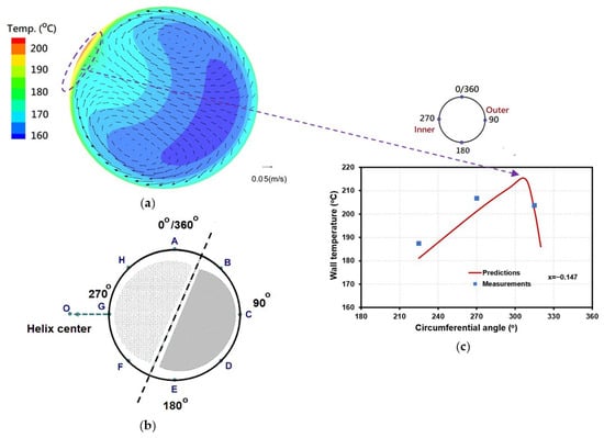 Figure 8. (a) Vector distributions of secondary flow and temperature contour on cross-section of HCT for Case 1; (b) assumed temperature contour in the test; (c) comparison of predicted and measured wall temperatures for ϕ = 210°~330°.
