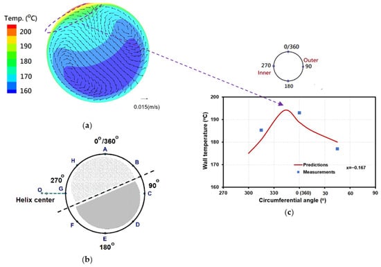 Figure 9. (a) Vector distributions of secondary flow and temperature contour on cross-section of HCT for Case 2; (b) assumed temperature contour in the test; (c) comparison of predicted and measured wall temperatures for ϕ = 300°~410° (50°).