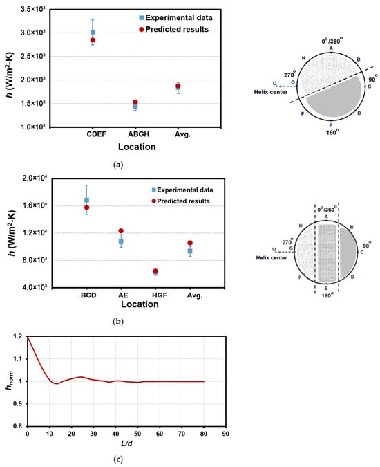 The correlations between the measured and predicted heat transfer coefficients in the different regions and the average value are also shown in Figure 10b for Case 3. Three regions with different heat transfer characteristics are suggested based on the measured data alone, but these characteristics are clearly visible in the predicted results in the density contour of Figure 6c. In addition, the predicted heat transfer coefficients shown in plots (a) and (b) of Figure 10 are fully developed. The heat transfer coefficient decreases from the inlet of the HCT and approaches its full value, as shown in Figure 10c for Case 3. In this plot, the longitudinal axis is the normalized heat transfer coefficient (hnorm), that is, the local h divided by the full value. The abscissa is the distance from the inlet of the HCT. A detailed observation of this plot implies that the entrance length (developing length) is about 42~50 pipe diameters (d). The correlation for the entrance length of an HCT was proposed by Saffari et al. [25]) and is expressed as a function of the Reynolds number (Re), Dean number (De), and curvature ratio (δ).