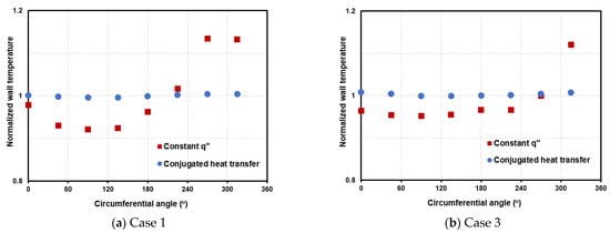 Figure 12 compares the circumferential dependence of the normalized temperature predicted using the constant-heat flux BC (HCT only) and the conjugated heat transfer (whole HCHX) simulations. The normalized temperature shown on the longitudinal axis is the local wall temperature divided by the average wall temperature. The simulation conditions under the constant-heat-flux cases in Figure 12a,b are similar to those for Cases 1 and 3. Figure 12 shows that the non-uniform circumferential distribution of heat transfer is essentially caused by the constant-heat-flux boundary condition on the HCT wall. This effect can be significantly reduced by actually considering conjugated heat transfer in the HCTHX. The wall heat flux would decrease (i.e., variable heat flux distribution) around the wall sites with poor heat transfer due to the lower tube flow velocity, resulting in a lower wall temperature. A more uniform circumferential distribution of the tube wall would be achieved. However, for the constant heat flux case, the wall temperature would significantly increase for the wall location with the poorest heat transfer, resulting in a non-uniform circumferential distribution of temperature. Figure 12 clearly confirms these results.