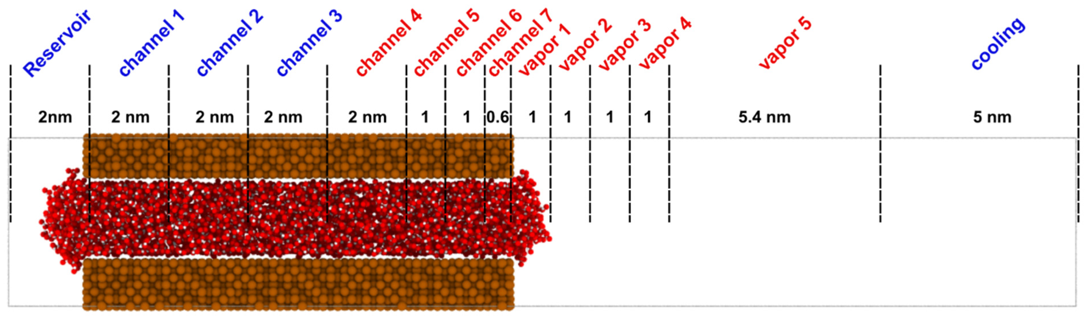 - Skarbalius, G.; Džiugys, A.; Misiulis, E.; Navakas, R.; Vilkinis, P.; Šereika, J.; Pedišius, N. Molecular Dynamics Study on Water Flow Behaviour inside Planar Nanochannel Using Different Temperature Control Strategies. Energies 2021, 14, 6843. [Google Scholar] [CrossRef]