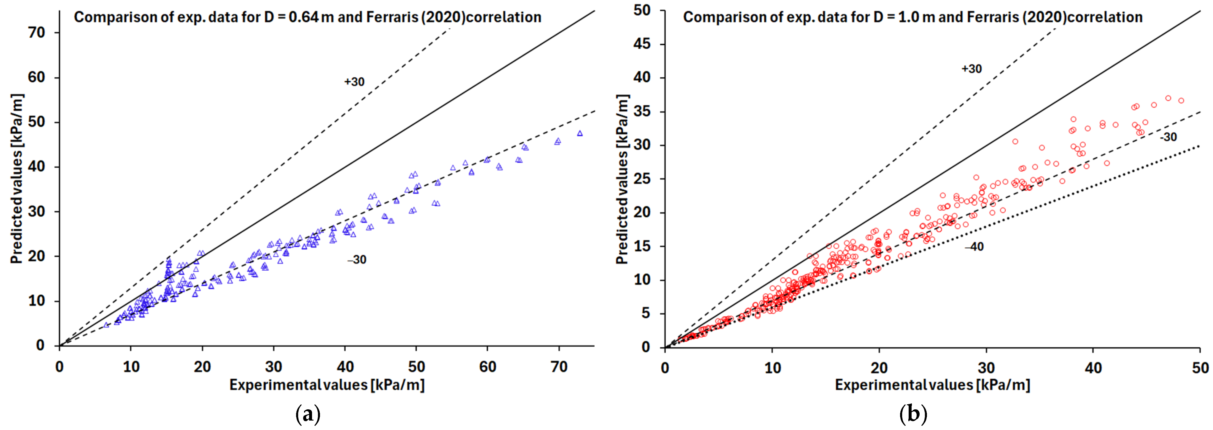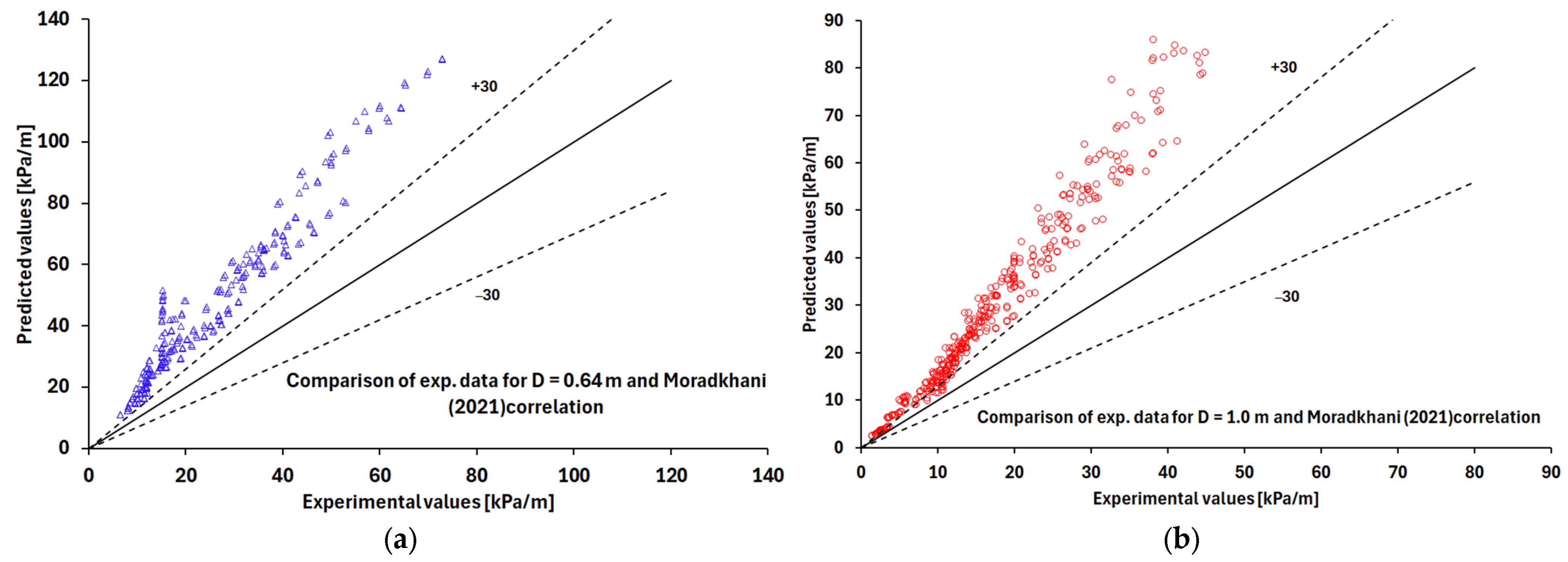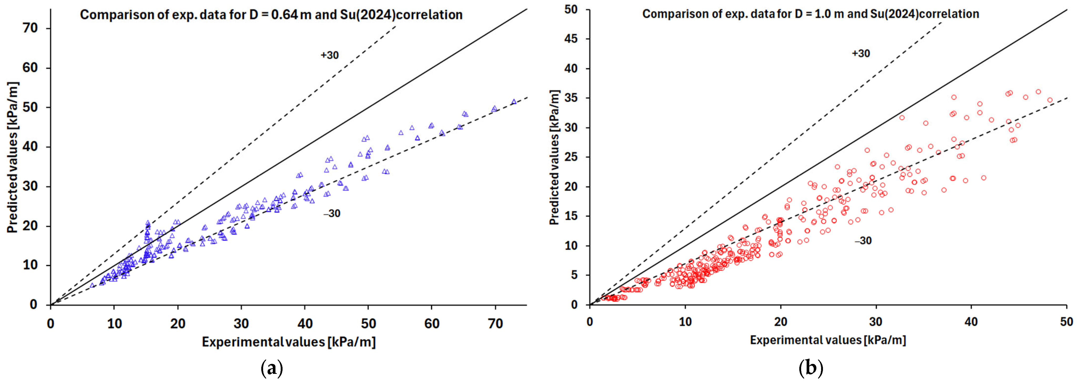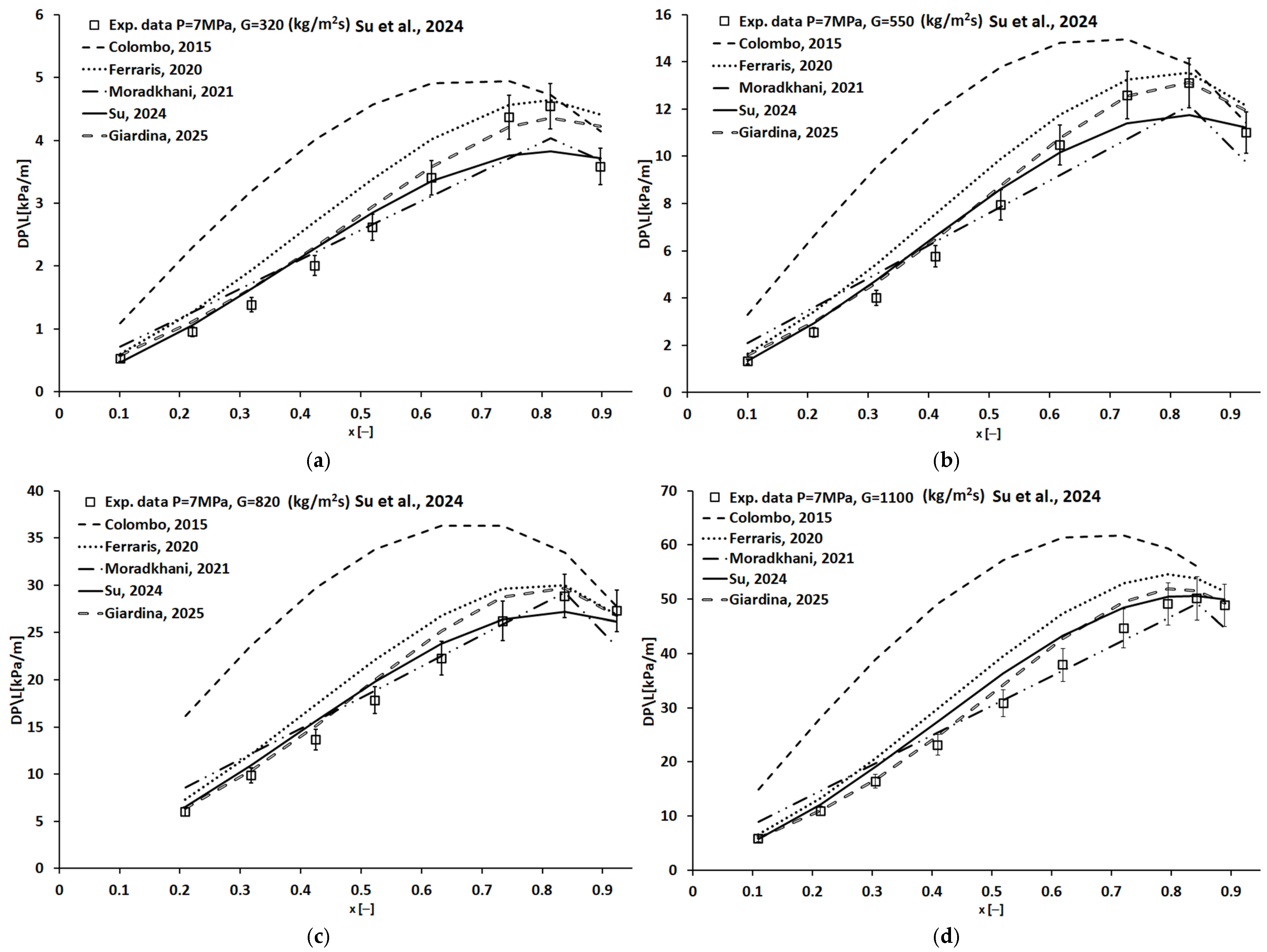 - Su correlation [5] performs with errors comparable to the Ferraris correlation. However, accuracy decreases at a mass flow rate of 1100 kg/m2s, pressure of 7 MPa, and high curvature ratios (δ = 0.107), where RMSE rises to about 33% (see Table 3). At pressures below 0.4 MPa and curvature δ = 0.01875, the experimental data exhibit large scatter around an average error of approximately −30% (Figure 5b).