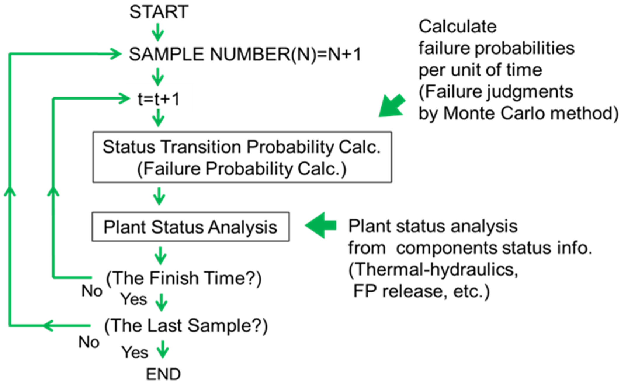 3]. In this methodology, scenario transitions are modeled as a Markov process, indicating that the plant’s current state (a combination of individual component states) is dependent only on its immediate past state, rather than any earlier states. Physical processes within plants are typically represented by Markov processes; plant dynamics analysis codes are employed to assess plant state. Events such as damage at a facility are influenced by local variables like temperature and pressure. That is, the occurrence probabilities of event are also updated based on the latest plant status. Thus, while static PRA has limitations in addressing fluctuations in plant conditions, the CMMC method allows these changes to be evaluated through plant simulation.