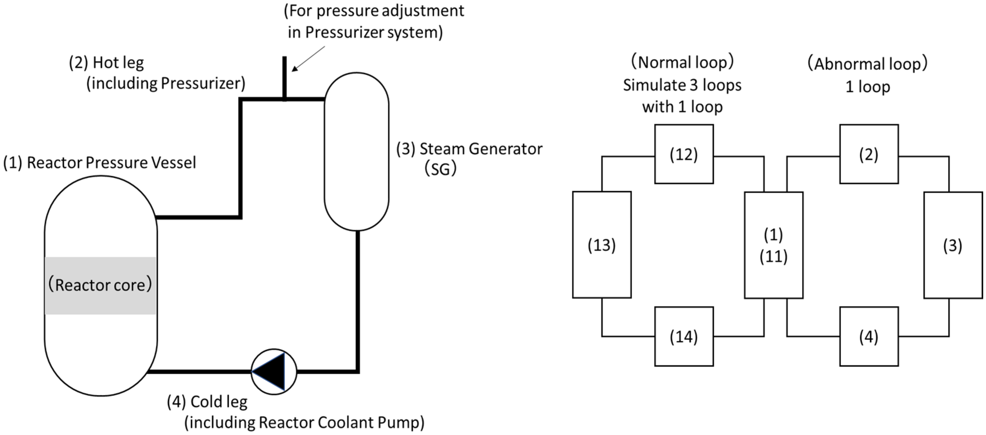 Figure 4. As shown in the figure, the primary system comprises four nodes: Reactor Pressure Vessel (RPV), Hot Leg (including Pressurizer line), Steam Generator, and Cold Leg (including pump). While the design assumes a four-loop configuration, three normal loops are simulated as one, resulting in an effective two-loop model—one normal and one abnormal loop. For each node, the governing equations for mass, energy, and momentum conservation are solved.