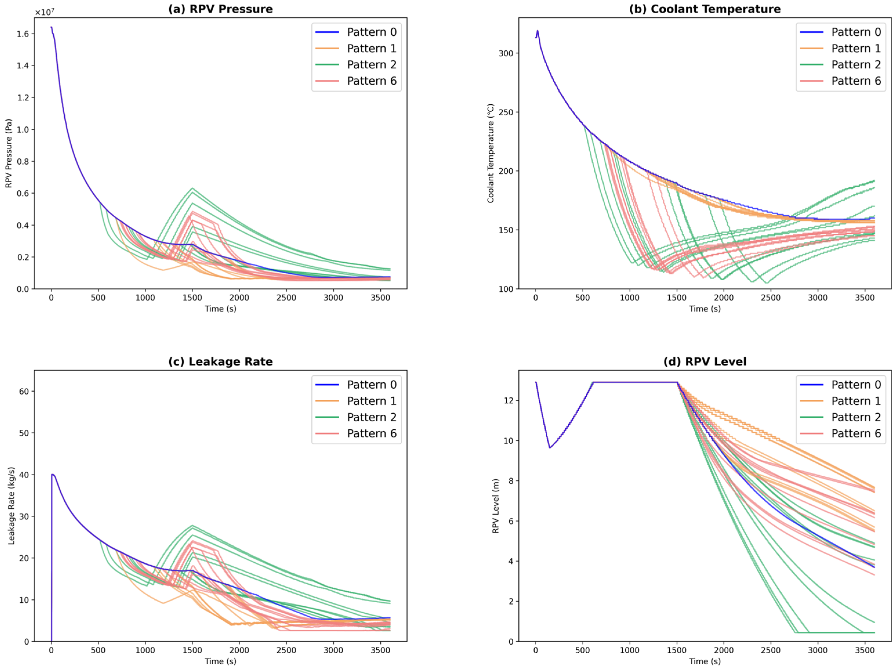Analysis results (Case 2: Patterns 0, 1, 2, and 6), (a) RPV pressure; (b) Coolant temperature; (c) Leakage rate; (d) RPV level.