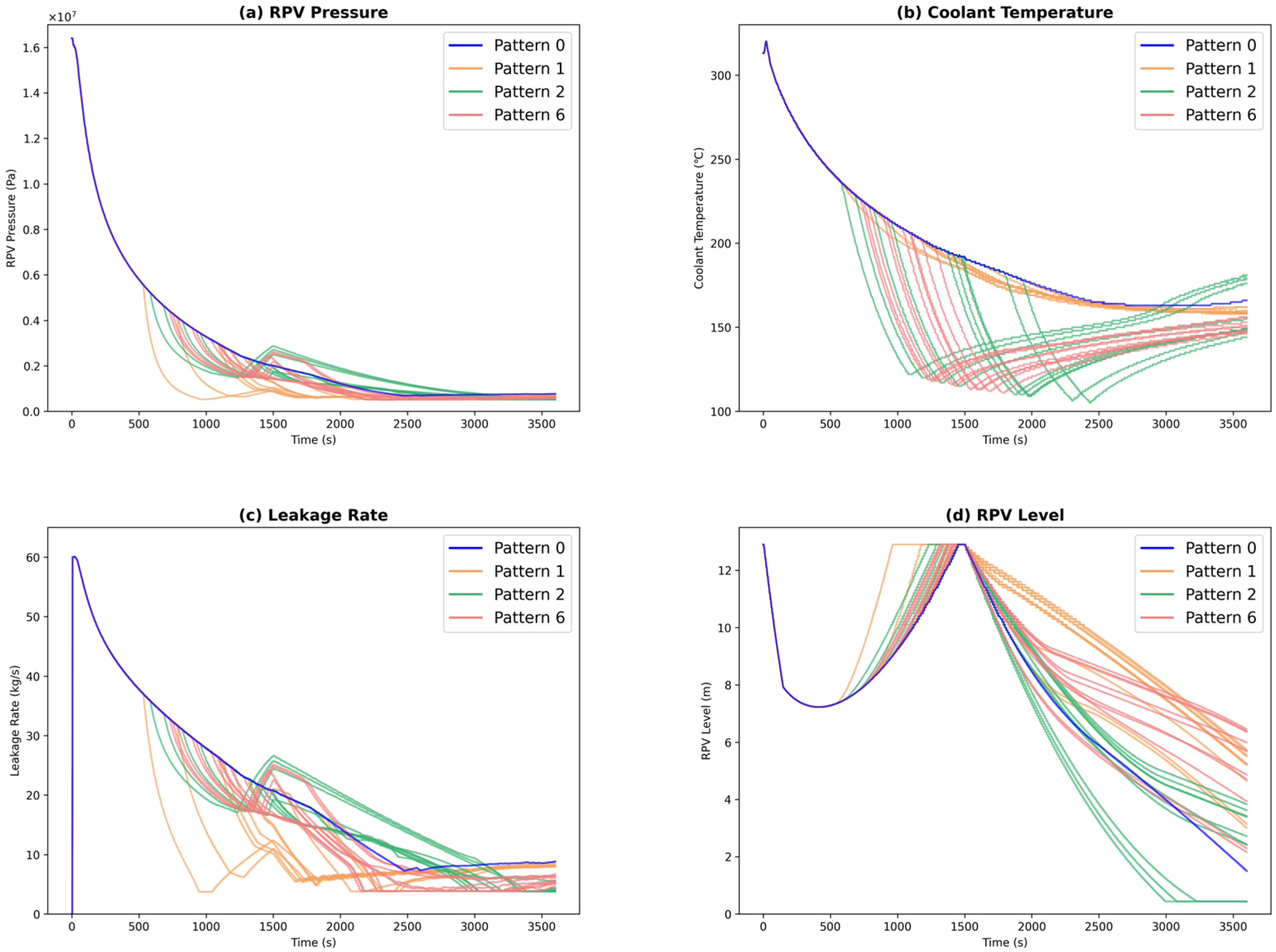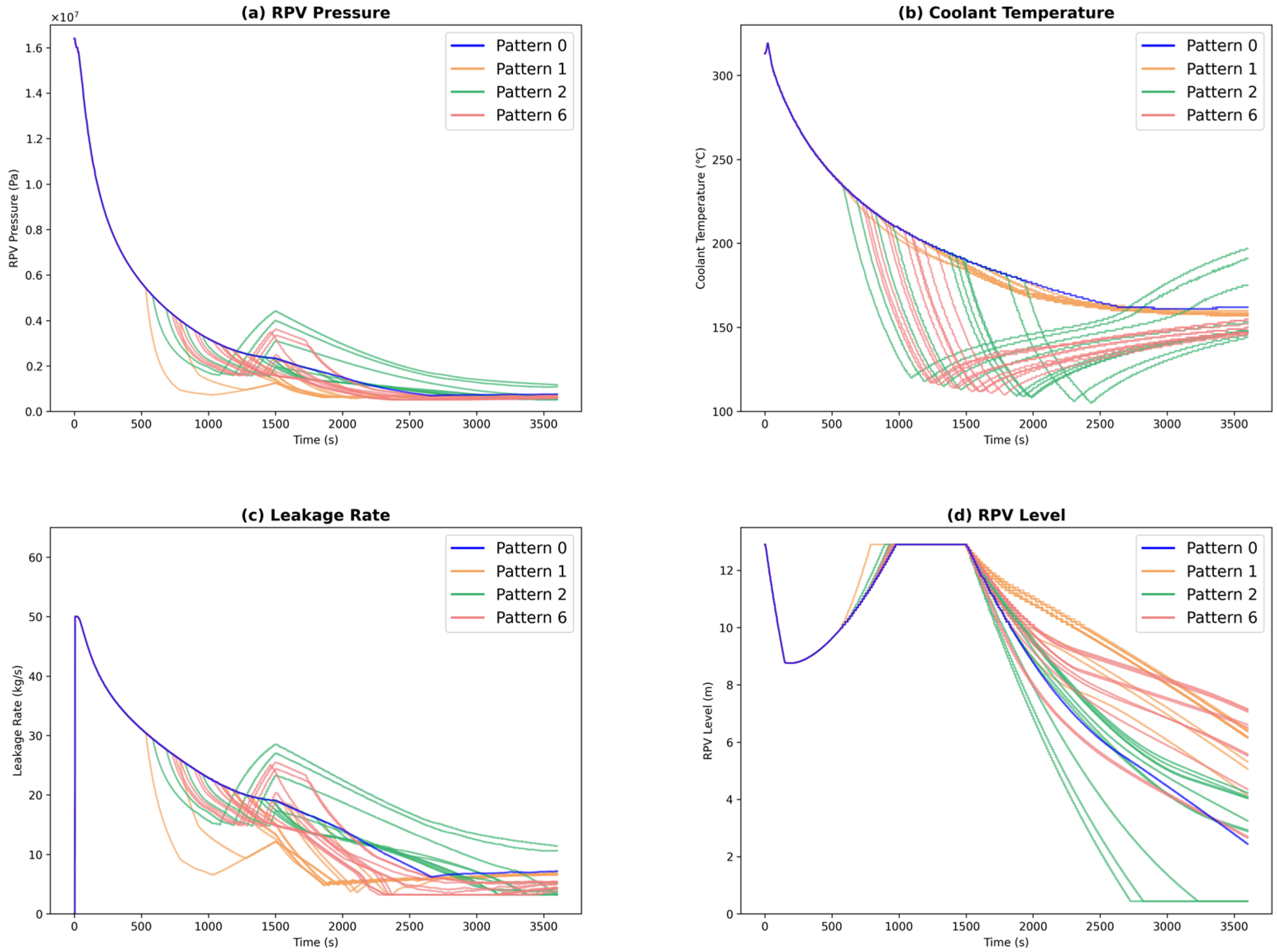 Figure 5 displays the trend graphs for RPV pressure, coolant temperature, leakage rate, and RPV level corresponding to Patterns 0, 4, and 6. The dashed line in