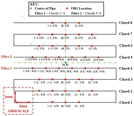 An FBG grid sensor has been designed that consists of two polymide-coated FBG arrays, each with 19 FBGs multiplexed upon them, with Bragg wavelengths ranging from 1527 nm to 1563 nm in 2 nm steps. An aluminium mounting gasket was manufactured, with the help of engineering staff and students at Coleg Menai, to secure the two FBG arrays into a concertinaed grid structure that can be mounted between DN50 flanges (Georg Fischer Piping Systems Ltd, Schaffhausen, Switzerland). Throughout this paper, the parts of the FBG grid’s optical fibres that pass through the fluid domain will be referred to as a chord. The nominal position of each FBG on the grid is shown in Figure 2, with each FBG along a chord being spaced apart by 8 mm, and each chord separated by 6 mm. The outer-most chords of the sensor are located equidistant from the edges of the mounting gasket so that the sensor is centred in the middle of the pipe.