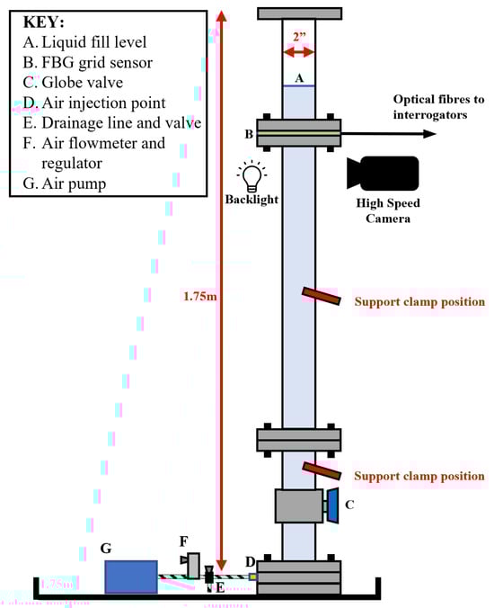 As shown in Figure 3, the FBG grid sensor was installed between the flange faces connecting the upper two transparent sections of the LCIR. The two optical fibres of the FBG grid sensor were then each connected to an SLD light source and an interrogator (optical analyser). Next, the LCIR was filled with deionised water until it was approximately 0.15 m below the top of the rig. After this, a Phantom 640 L (Vision Research Inc., Wayne, NJ, USA) high-speed camera with a Nikon (Nikon Corporation, Tokyo, Japan) 24–85 mm F/2.8-4D lens, was setup adjacent to the LCIR and aligned to record the propagation of bubbles immediately before the bubbles reached the FBG grid sensor. This allows for the data produced from the FBG grid to be compared to high resolution videos of the bubbles producing the responses from the sensor. Enabling a comparative assessment of the sensor’s ability to accurately and precisely detect or dimension air bubbles that pass through it. Behind the LCIR, a spotlight (Nanlite, Shantou, China) was setup to provide backlighting for the high-speed camera’s recordings to improve the clarity of the bubbles imaged, particularly for the air–oil experiments.