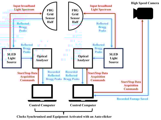 Each frame from the high-speed camera is saved with a time stamp, and the sample times of the optical analyser are inferred from the sample rate, but with reference to a time stamp for the first data point, allowing the data produced from the FBG grid to be synchronised to the corresponding frames of the high-speed camera’s recording. This enables a detailed analysis of the causes of different Bragg wavelength shifts displayed in the FBG grid sensor’s data. To ensure the use of an auto-clicker provided accurate synchronisation between the optical analysers and the high-speed camera data, for each trial, the absolute time stamps at the start of each data recording were compared. This led to the identification of an approximately 0.5 s delay between the start of the optical analyser data capture, and the start of the high-speed camera recordings. Further investigation identified this discrepancy arose from a combination of a processing delay from the auto-clicker’s sequential execution of commands, and the time required by the high-speed camera to clear its internal memory. Therefore, to rectify this issue, the absolute time stamp from the high-speed camera recording’s first frame was used to align the two data sets. To prevent this in future work, a new trigger system will be developed to remove this delay.