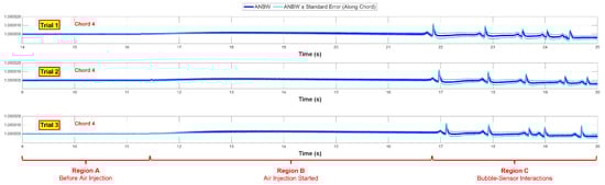 Finally, to demonstrate the cross-trial consistency of the results presented from trial 1, Figure 7 shows a comparison of the ANBW shift along chord 4 in trials 1–3 of the air–oil experiments. Just as with Figure 5 and Figure 6, Figure 7 is restricted to not show time from t = 0, but similarly shows the response of the FBG grid from just before air injection is started, until after the first five large air bubbles have passed through the sensor. Despite the difference in timings between the start of data capture and air injection between the trials, this example comparison shows the consistency of the FBG grid’s response between the repeated trails. As shown in Figure 7, each trial features the same three regions congruent with regions A, B, and C observed in Figure 5 and Figure 6. Furthermore, as will be discussed in Section 4.2, trials 1–3 show a multi-peak ANBW shift that occurs when bubbles pass through the FBG grid, supporting this later analysis of bubble–sensor interactions. This includes the multi-peak ANBW shifts being of similar magnitude, as expected from the consistent size of the bubbles produced in the air–oil experiments.