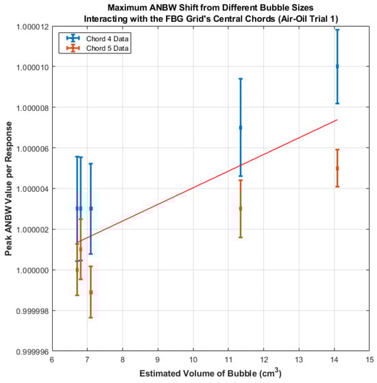 Comparison of bubble volume against the maximum ANBW shift value produced by the bubble passing through the FBG grid (air–oil trial 1). The red line on this figure provides a trend line for the data.