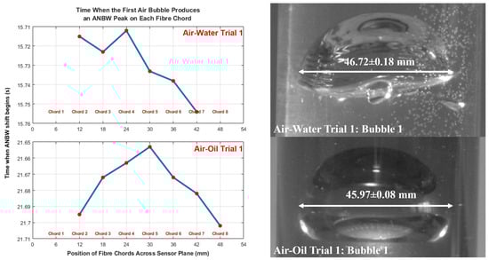 Consider again the first, and largest, air bubbles that pass through the FBG grid in both the air–water and air–oil experiments, these being bubble number 1 in both Table 1 and Table 2. To determine if the profile of the top of these bubbles can be reproduced, the time when each chord’s first ANBW peak began to increase is plotted against the chord’s positions in the sensing plane—as shown in Figure 10. From this graph, it can be seen that, for the air–oil experiment, a parabolic profile, centred in the middle of the FBG grid, exists between the timings of the first ANBW responses across the sensor’s chords. This observation is in agreement with the shape of the leading edge of the bubble, as recorded in the high-speed camera data, and also conforms to the anticipated response expected from the results published by C. R. Zamarreño et al. [,,]. However, no such parabolic relationship is present in the response timings from the air–water experiment’s first bubble. Instead, a more sloped profile is seen, with chords 5–7 responding first, before chords 4, 3, and 2 sequentially. A possible explanation for this difference in response time profile could arise from the behaviour of bubbles in different viscosity liquids. In the air–oil experiments, the motion of the rising bubbles is much more regular and less erratic than the air–water tests. Therefore, in the region between the base of the flange and the sensor, when the bubble is unobserved by the high-speed camera, the bubble’s motion or shape could become perturbed, or be uncentred, leading to the slanted shape of the response time profile. Regrettably, validation of this proposed explanation is not possible without direct observation of the FBG grid as bubbles pass through it. This could not be achieved with the configuration of the LCIR; hence, further experiments will need to be conducted to analyse this proposed explanation.