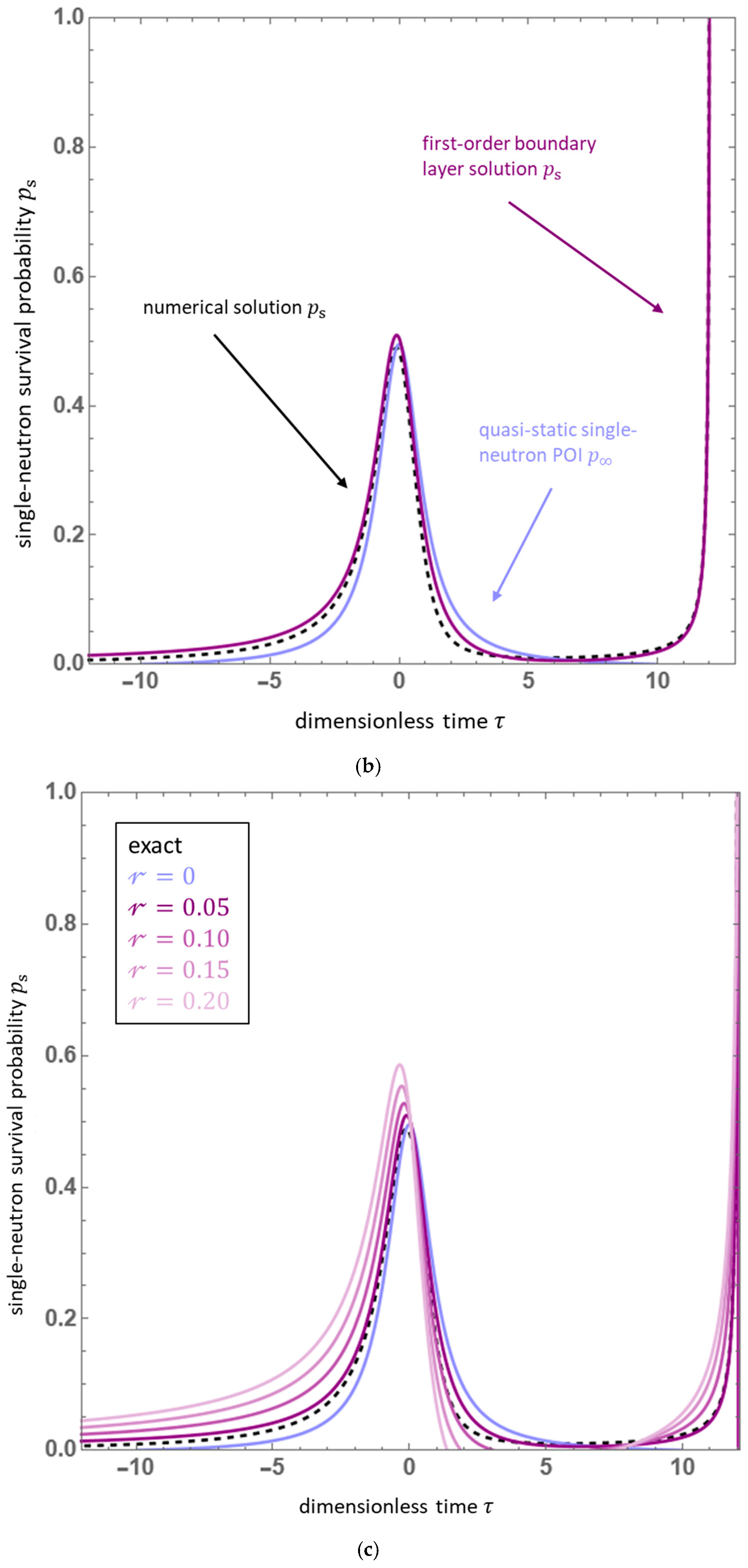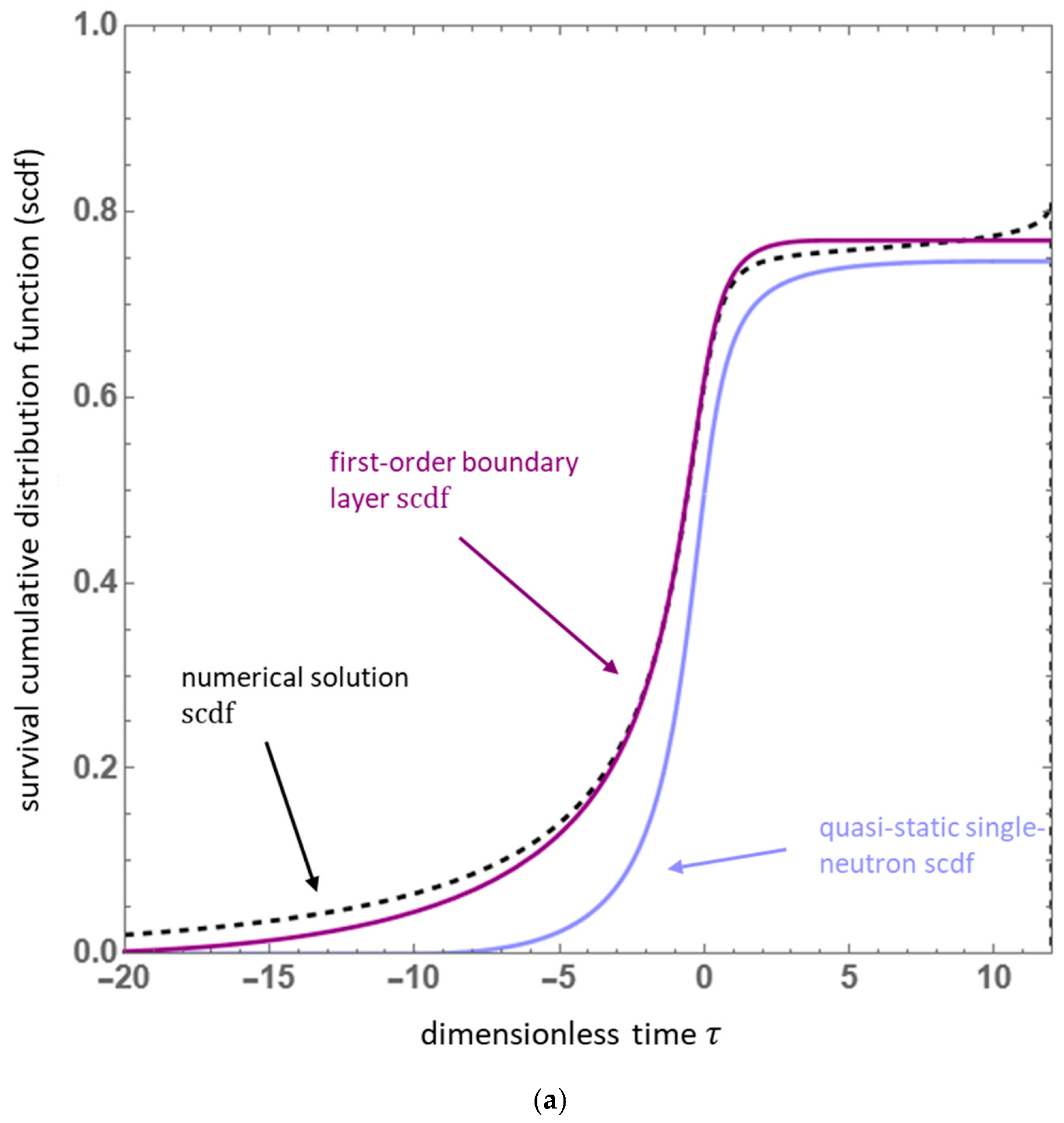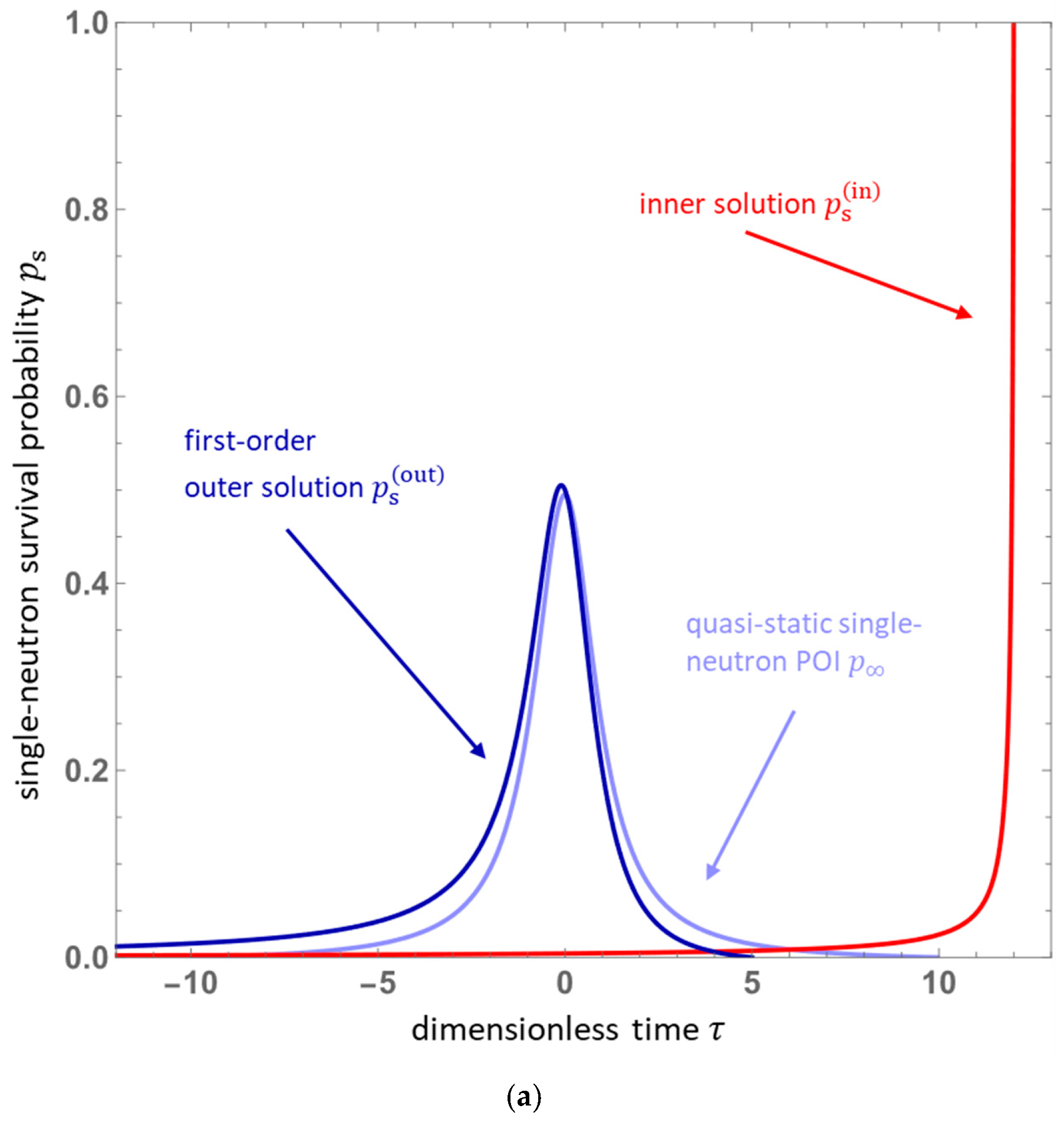 - Boundary layer theory: The likely magnitude of the time-scale ratio appearing in Equation (38) suggests a perturbative approach to its approximate solution, which, given the placement of therein, must be of the singular variety. The boundary layer approach pursued in Section 3.1 is one such manifestation of a singular perturbation theory, which employs as an expansion parameter within an outer solution region. In this construction, the boundary layer—wherein the associated final condition must be satisfied—is a comparatively narrow region joined to the outer solution and satisfies a distinct limiting form of the single-neutron survival probability equation.