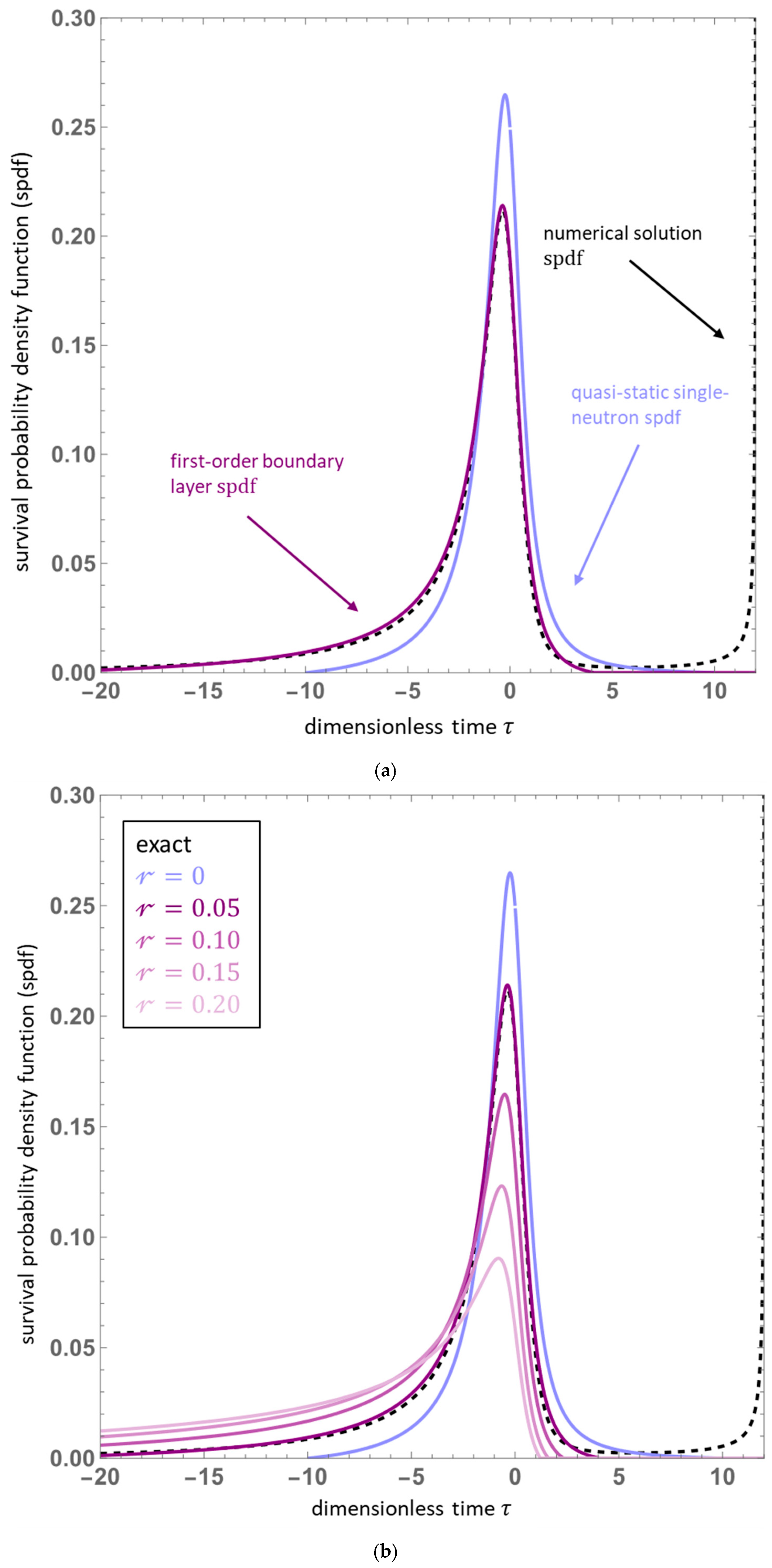 - In the proximity of the quasi-static curve (i.e., within the outer solution) higher-order effects again drag the probability fields leftward, most notably resulting in a non-zero probability tail during late-time subcriticality. This tail extends from τ−(1) ≤ τ ≤ τc, and its magnitude within this range is proportional to c(out) [and hence, via Equation (89), both and S0]. During this interval, the (zero) quasi-static initiation probability density function and quasi-static source-neutron POI underestimate the probabilities owing to the finite dwell time between neutron generation events.