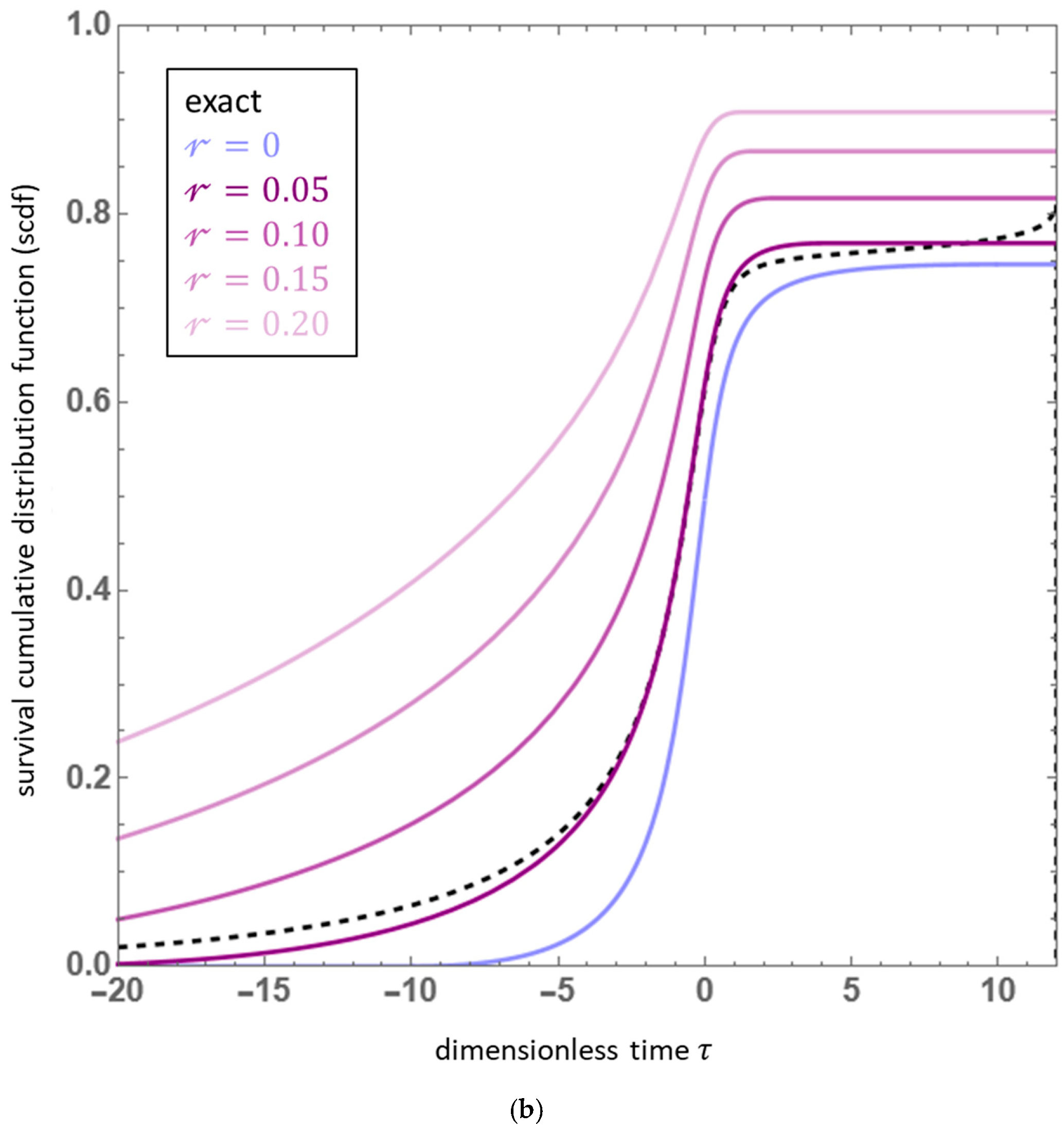 - Equation (38) is considerably simplified under the assumption J = 2, which is referred to throughout the existing literature as the “quadratic approximation” [42,43,53,54,56,59,62]. The quadratic approximation involves the truncation of the factorial moment summation given in Equation (14), and not the fission multiplicity distribution defined following Equation (1). The limitations and consequences of this approximation are considered at length by authors including Hill and Ramsey and Hutchens [43,60]; in short, the quadratic approximation is typically viewed as being more viable for uranium-based systems (e.g., β2 = 0.89, β3 = 0.43, β4 = 0.12, … for U-235 at 1 MeV [60]) than their plutonium-based counterparts (e.g., β2 = 1.13, β3 = 0.69, β4 = 0.24, … for Pu-239 at 1 MeV [60]). Under this assumption, Equation (38) indeed attains only quadratic nonlinearity and is hence both a homogeneous Riccati equation and an index-2 Bernoulli equation [63,64,65]. For arbitrary ρ(τ), this equation features a solution in terms of quadratures; by far the most analysis is thus devoted to the closed-form special case where ρ = const [43,53,54,56,58,59,62,66,67,68].
