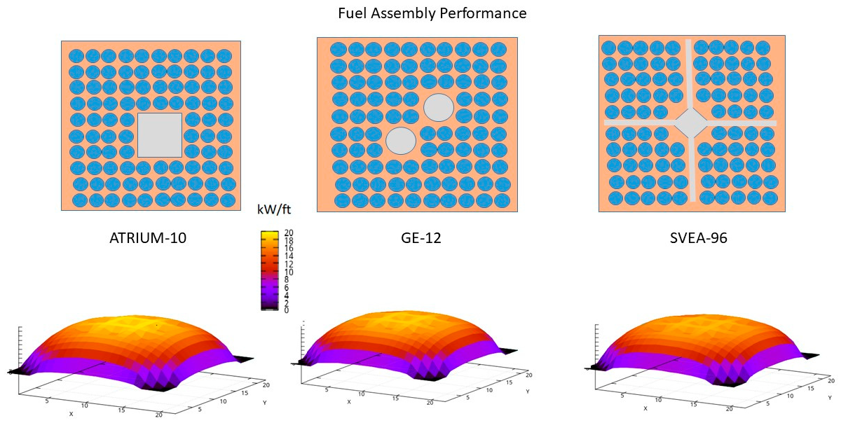 The present study has the objective of assessing the performance of three different BWR fuel designs, Atrium-10, GE-12, and SVEA-96, all of which have implemented the improvements mentioned above, but with a different perspective on the use of inner water channels and partial length rods, having in common a 10-by-10 fuel rod arrangement and different symmetry. At the fuel assembly level, comparisons will be made between enrichment and fuel design, as well as fuel pin power distributions. At the reactor core level, the analysis will show compliance with thermal limits and the cycle length.
