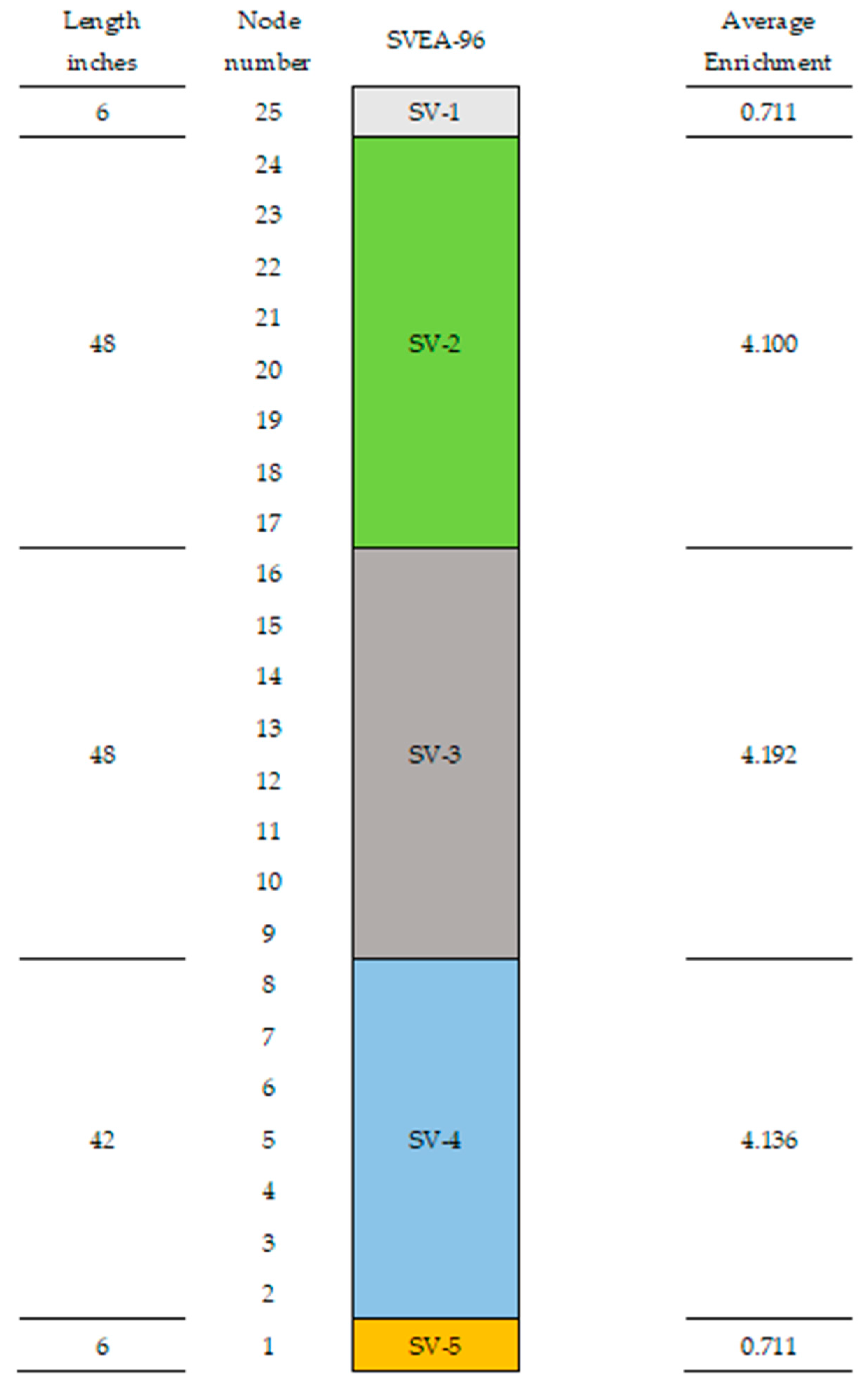 The active height of the BWR fuel assembly is 150 inches, divided into 25 planes, each 6 inches (15.24 cm) thick. SVEA-96 has an axial design composed of 5 sections, where the bottom section has a uniform radial composition of natural uranium; the top section (SV-1) includes 12 empty spaces due to the use of short rods in the four corners of the fuel assembly and 8 short rods around the central water channel [