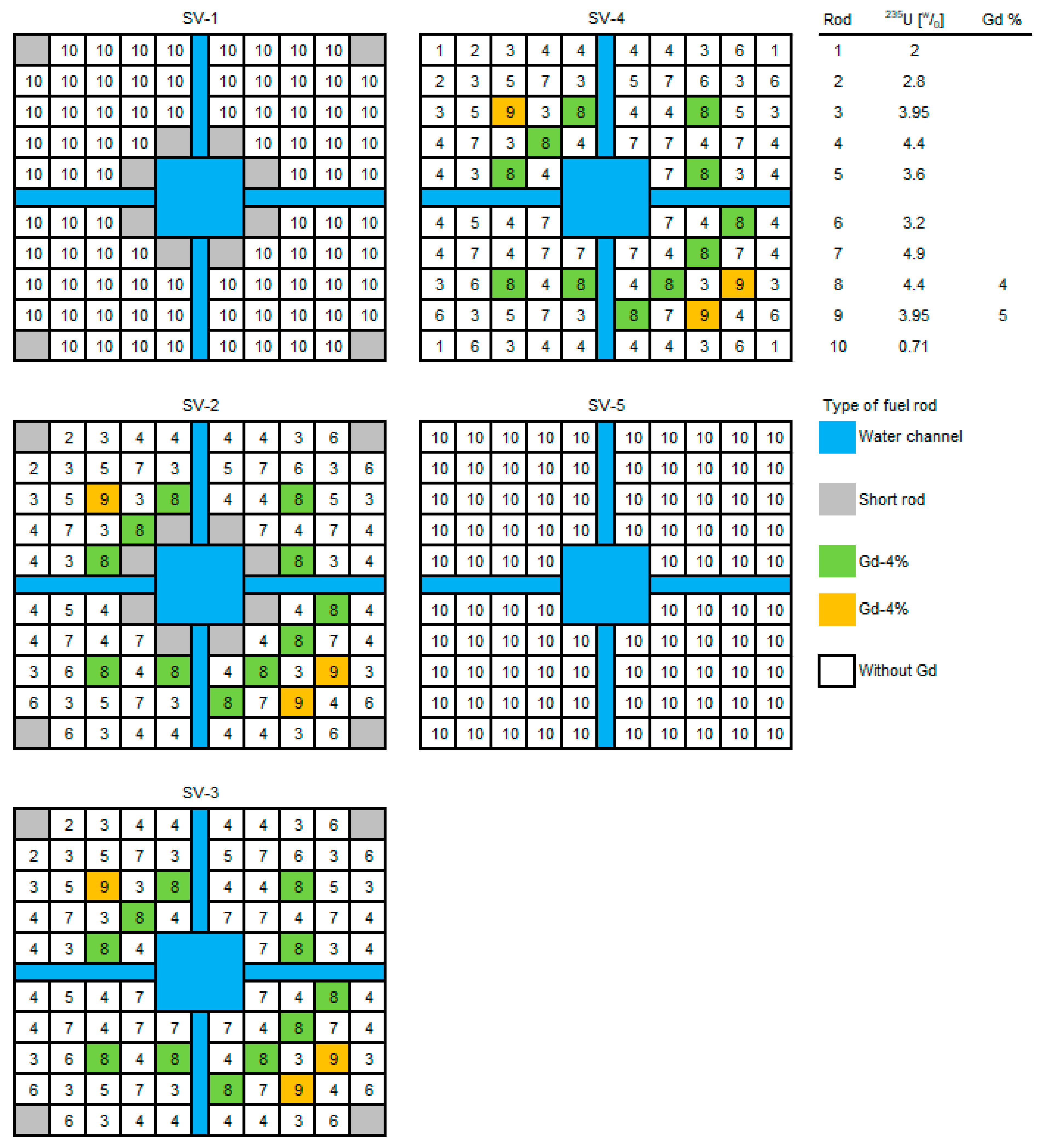 7]. It has a uniform radial composition of natural uranium; these short rods are also in the SV-2 cell type. The SV-3 fuel cell type has only short rods at the corners, whereas the SV-4 has none.