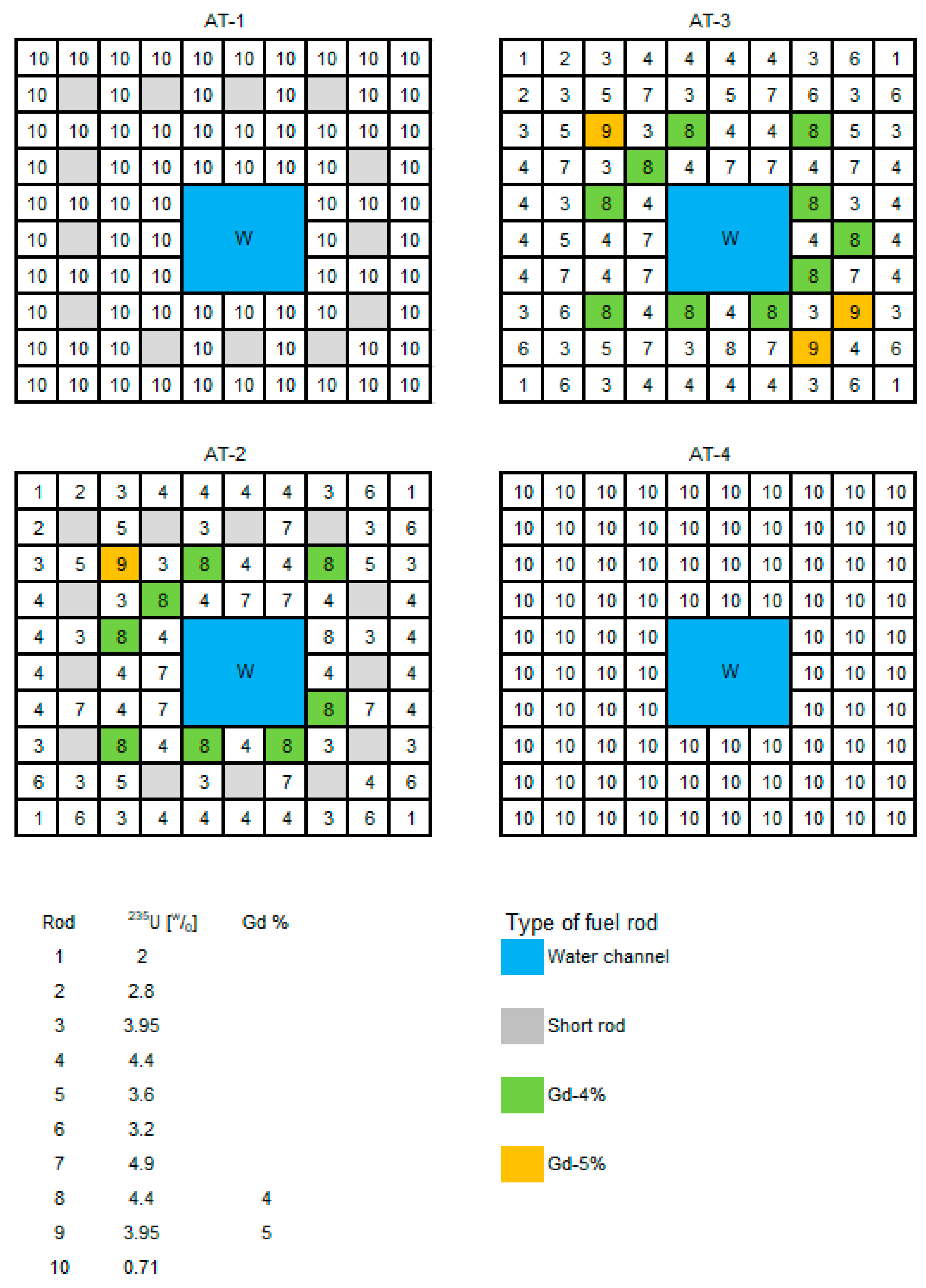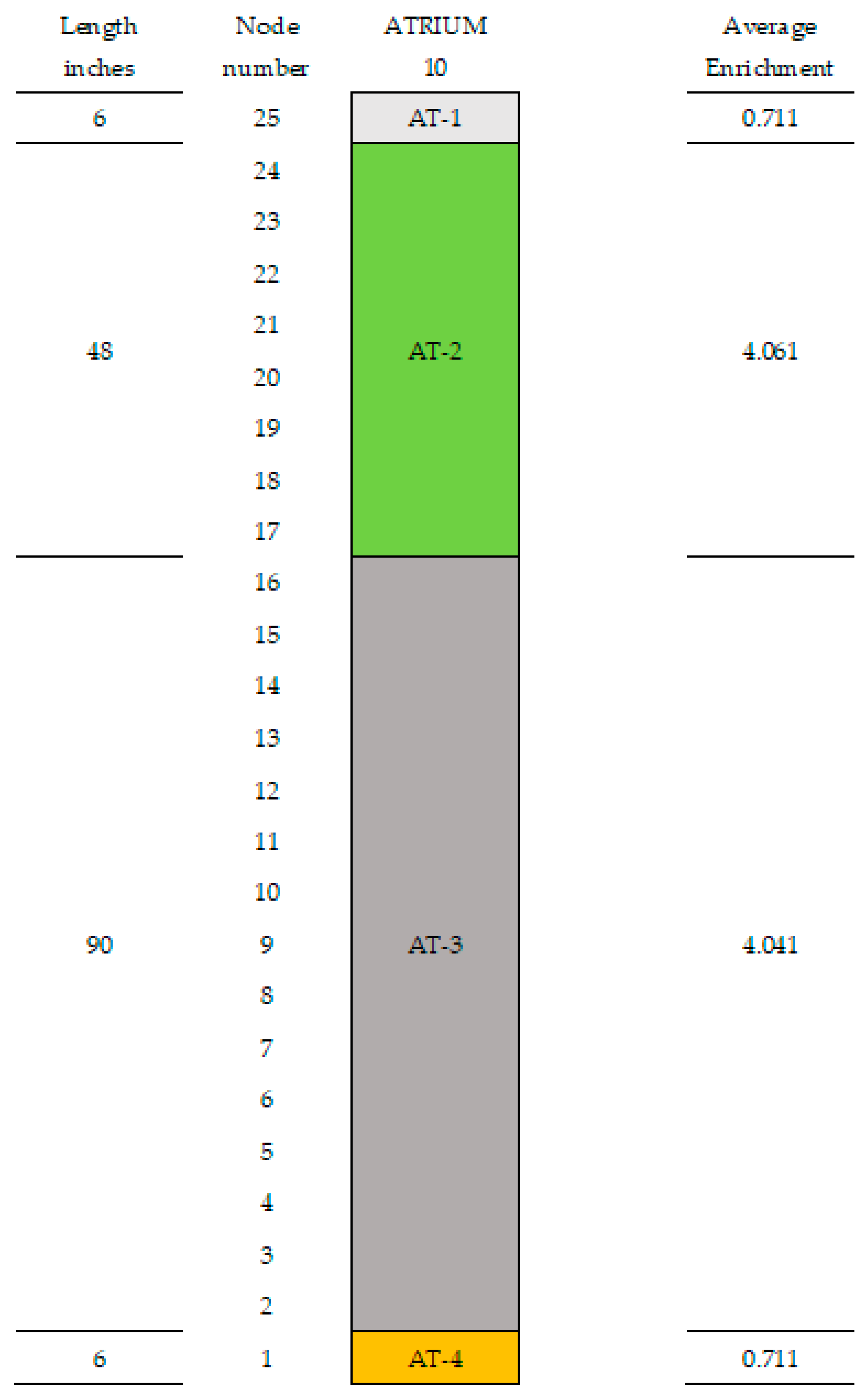Figure 3). The top section contains 13 short rods, which are also present in the AT-2 section. Atrium fuel cells maintain half-enrichment symmetry from top-left to bottom-right [