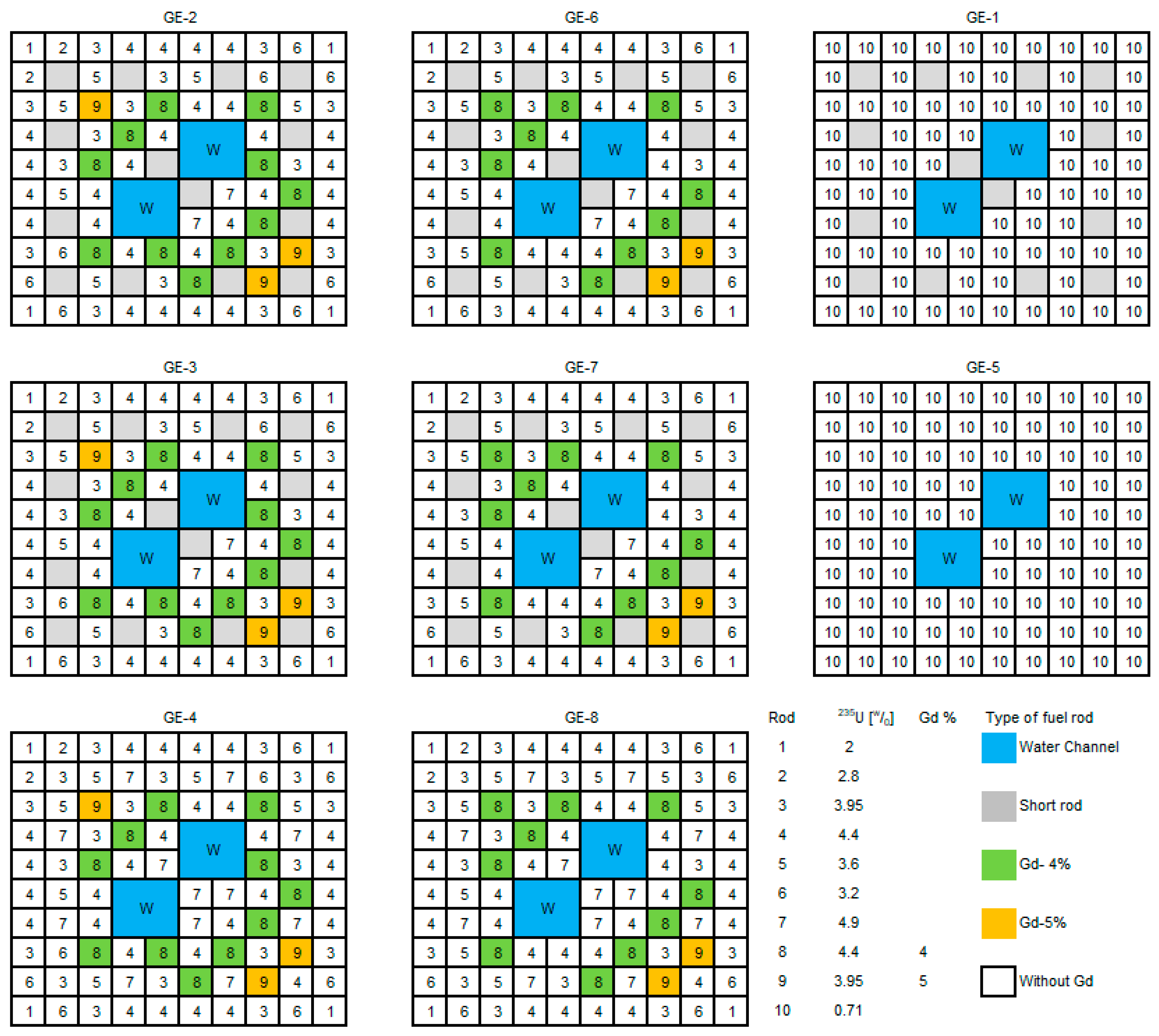 Figure 5 shows these designs. Both designs have 14 short rods that are in the GE-1, GE-2, GE-3, GE-6, and GE-7 sections. GE-12 fuel cells maintain half-enrichment symmetry from top-left to bottom-right [